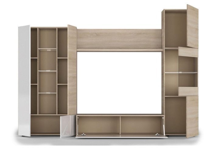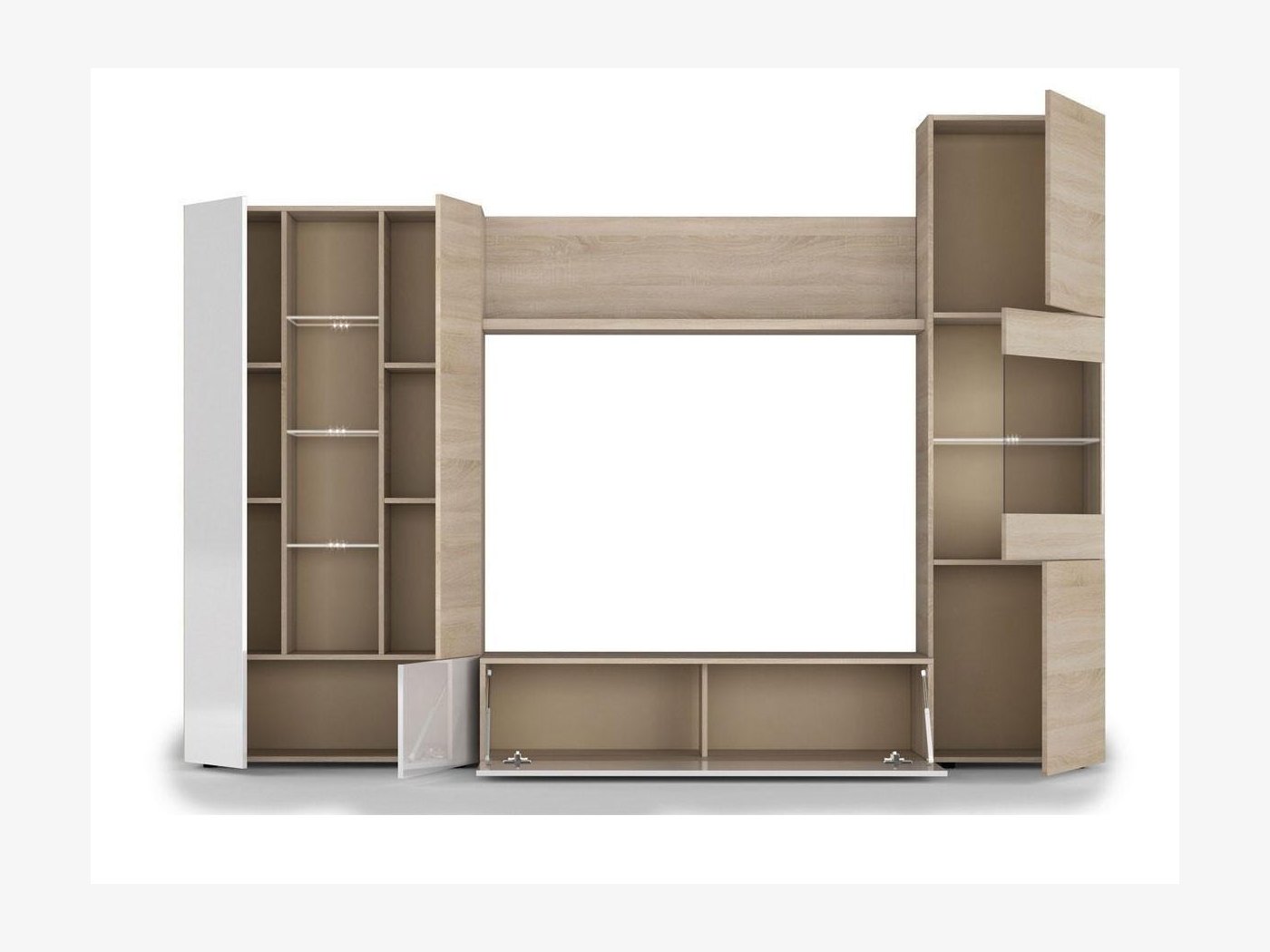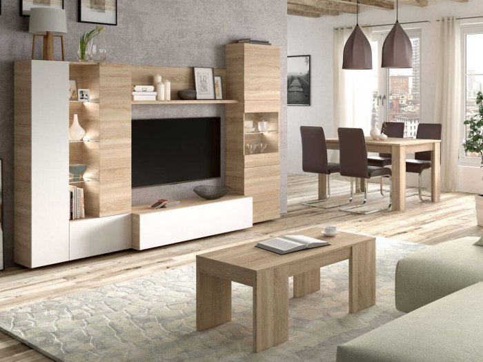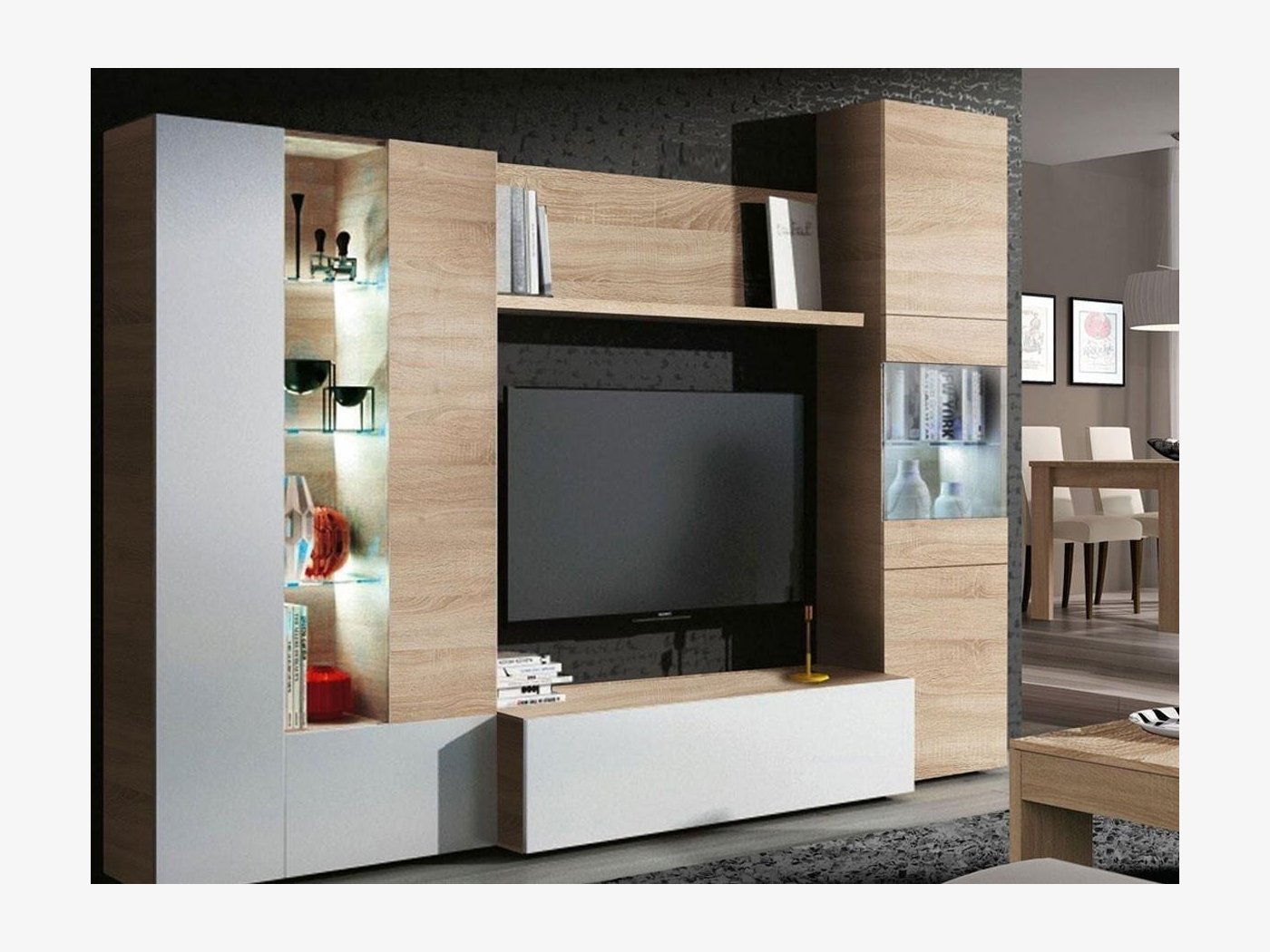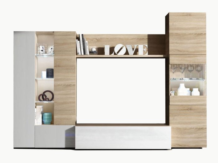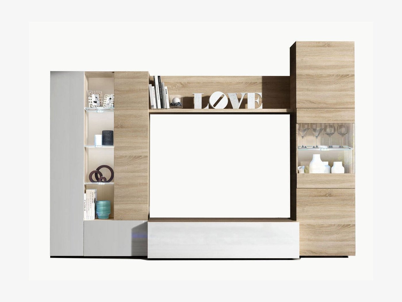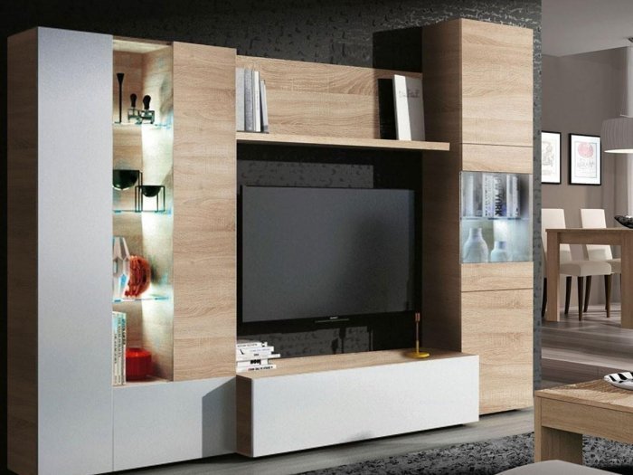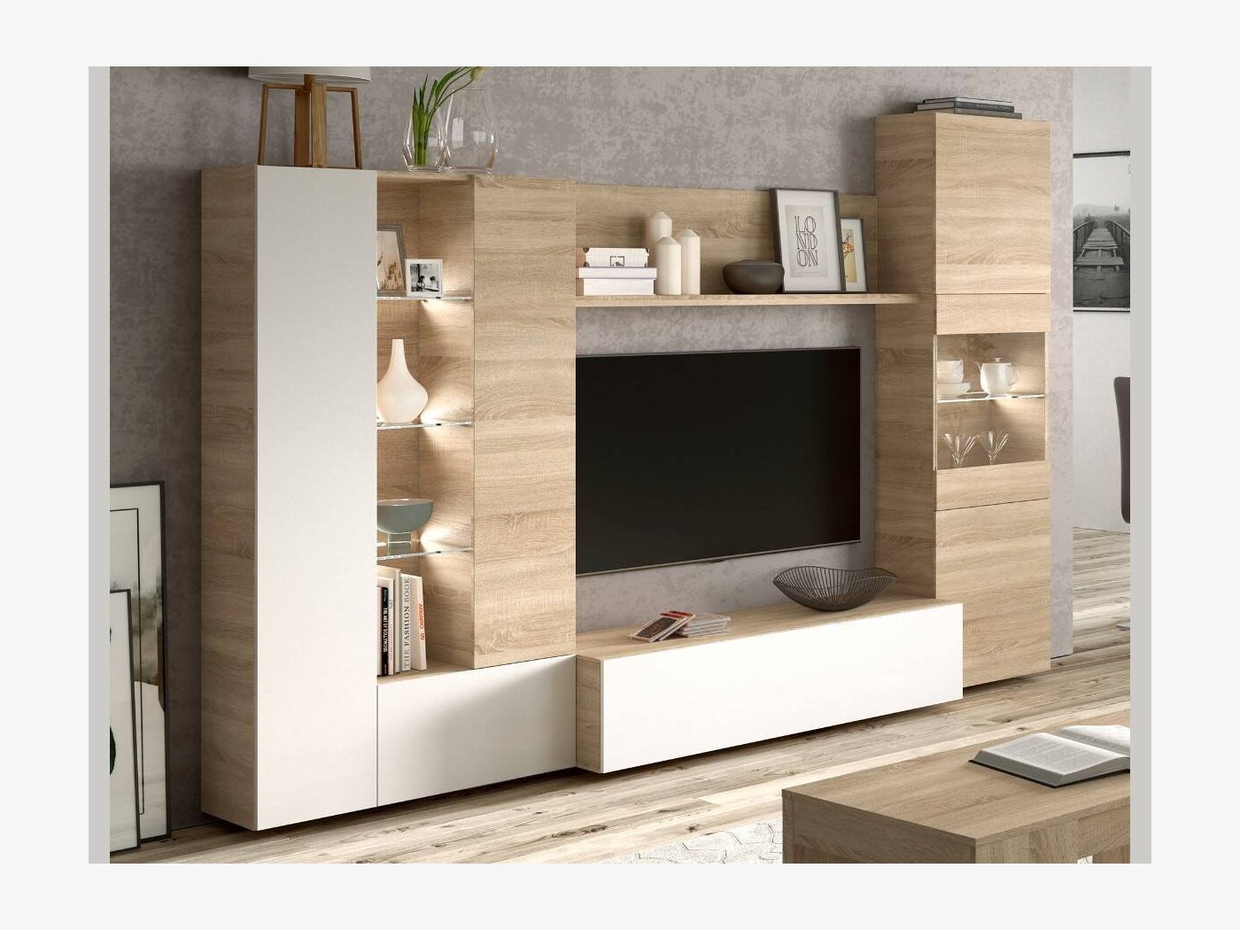 Formado por vitrina con cristales laterales vistos y luces led, módulo bajo tv y alto vitrina.