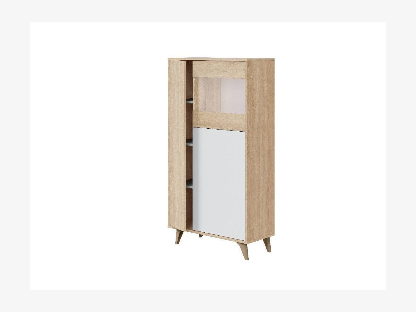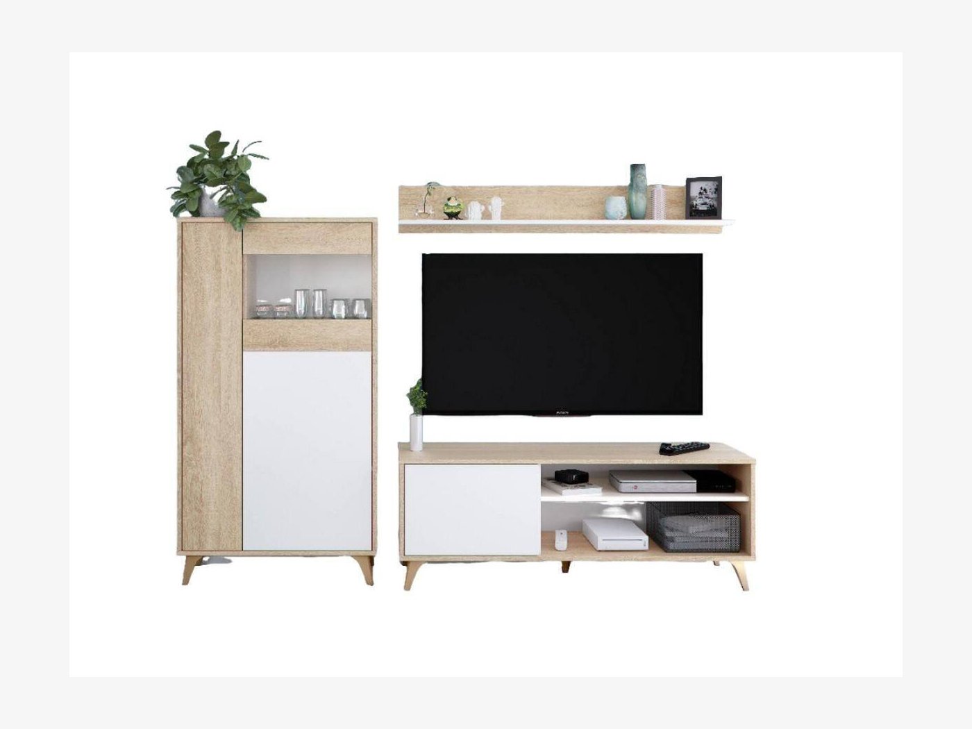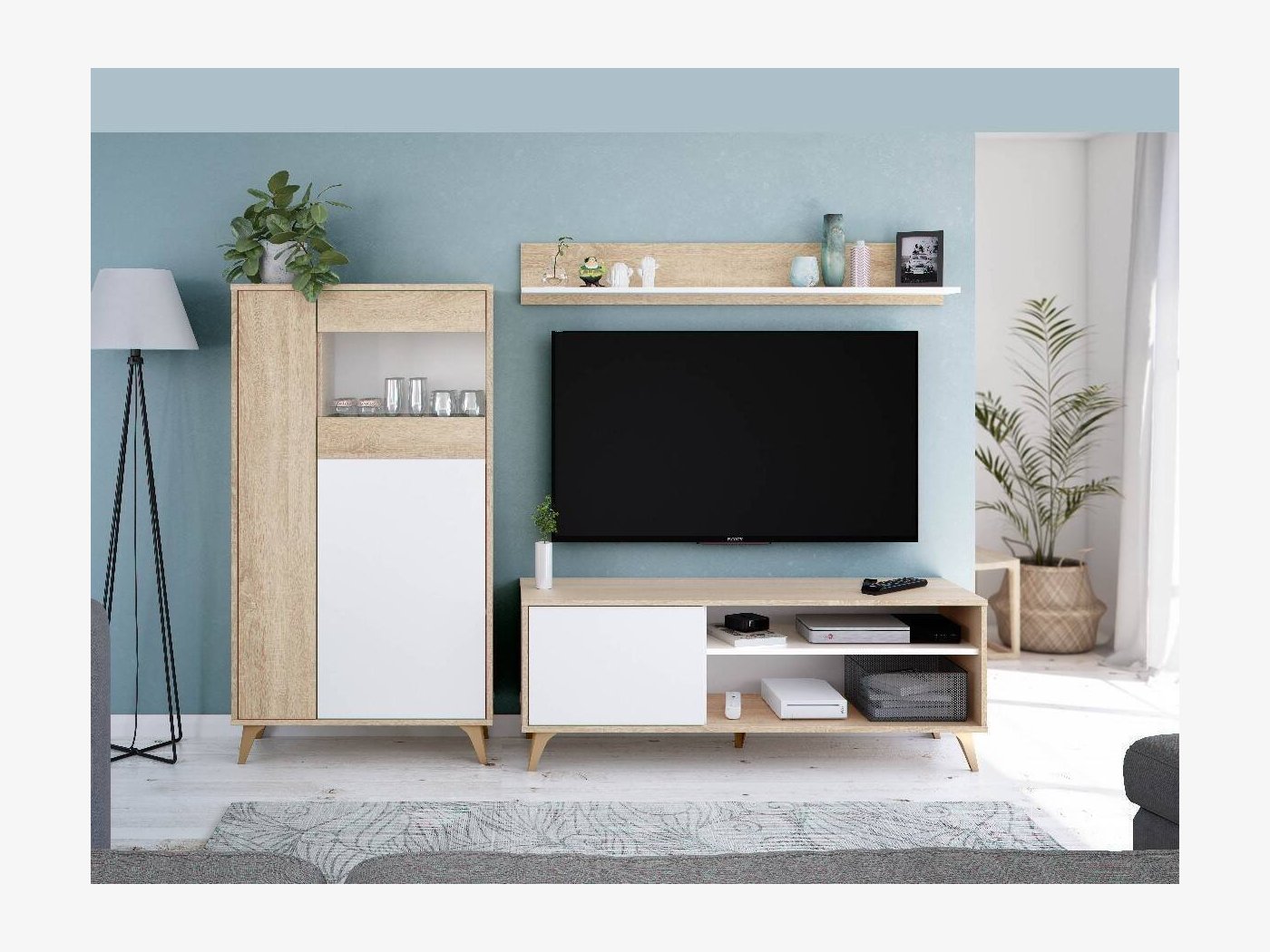Formado por un bajo Tv con estantería y una vitrina de 3 puertas. Disponible en color roble veta combinado blanco veta