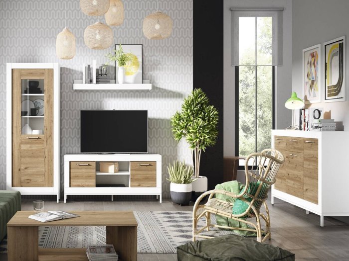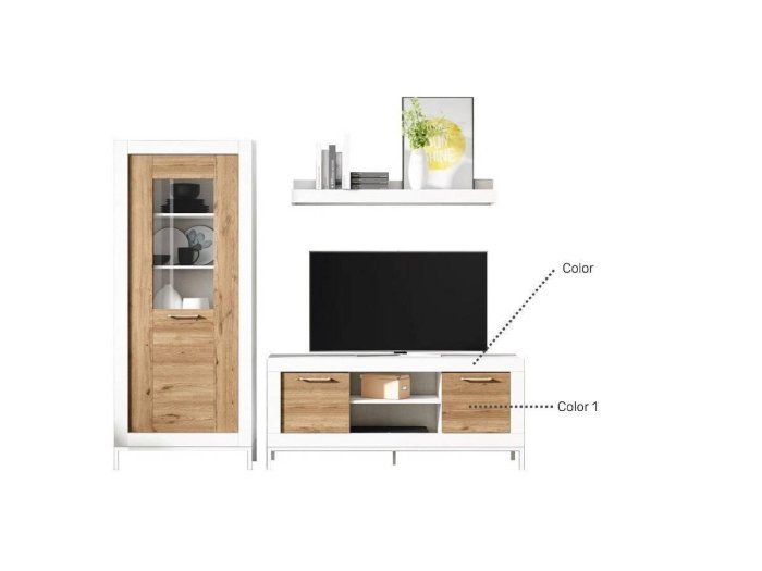 El Mueble Modular DAKOTA es el equilibrio perfecto entre funcionalidad y belleza. Compuesto por un mueble bajo para TV que incluye dos puertas y estante, junto a una vitrina alta y estante de pared. Este conjunto te ofrece prácticas soluciones de almacenamiento sin sacrificar su elegante presentación. El estante colgado complementa el conjunto, ideal para mostrar tus objetos decorativos favoritos.