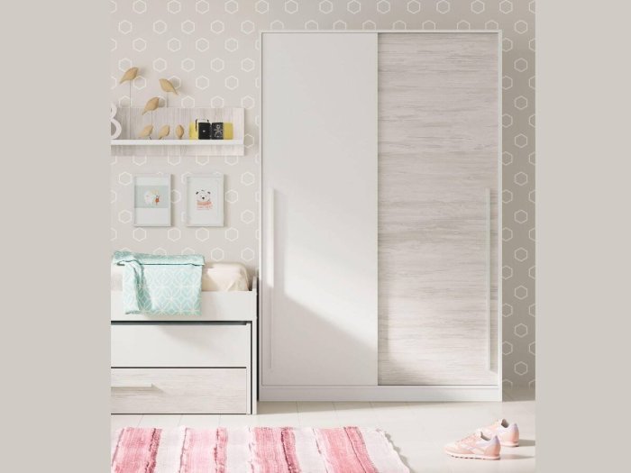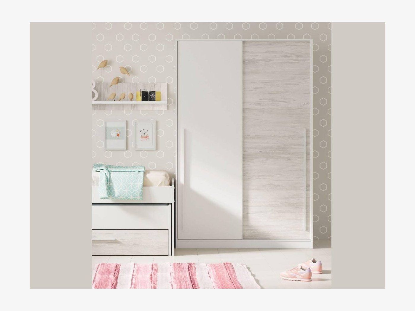 Armario de 2 puertas correderas equipado con barra de colgar y 4 estantes en su interior. Es el complmeneto perfecto para las habitaciones Nave