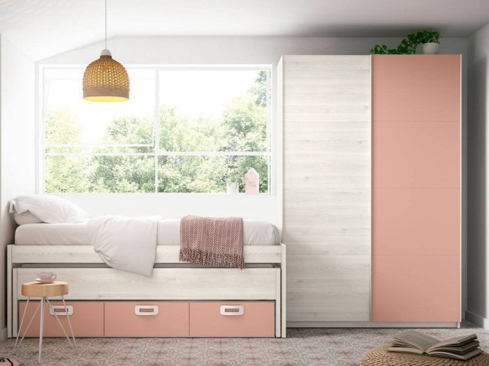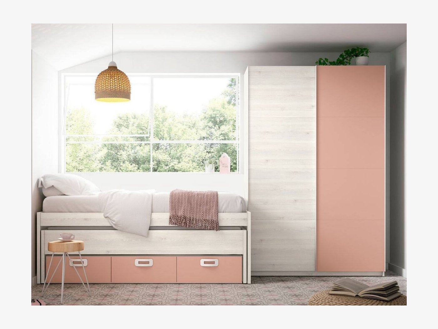 Tablero de melamina de 30 mm. combinado tablero de 16 mm. Interiores de montaje no visibles en color estandard, que puede no coincidir con el color escogido de cama. Perfiles color gris