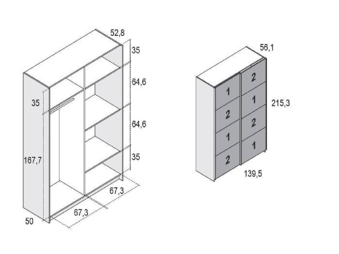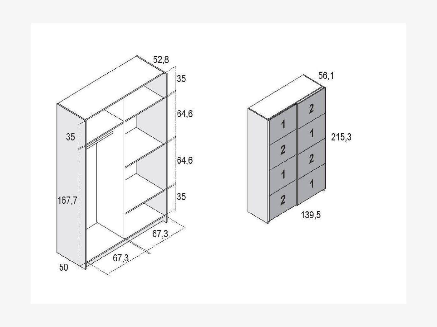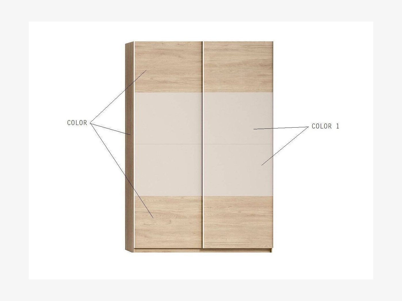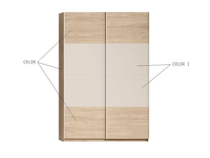 Por defecto, estructura y 4 rectángulos del frontal del armario serán en el mismo color. La colocación de los rectángulos se decide en el montaje del mueble.