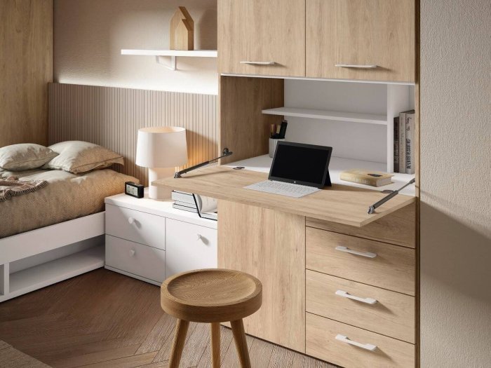 La zona central está equipada con un escritorio abatible con pequeña estantería trasera, consiguiendo una zona de estudio o trabajo en un espacio muy reducido.