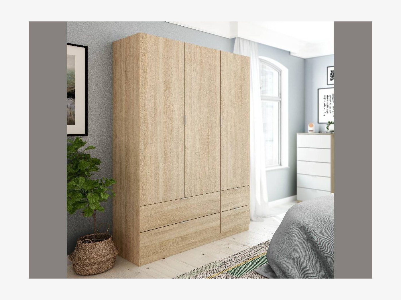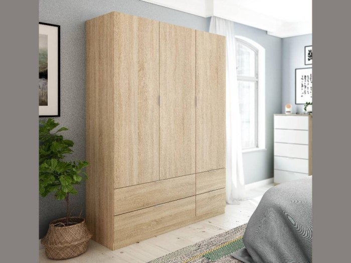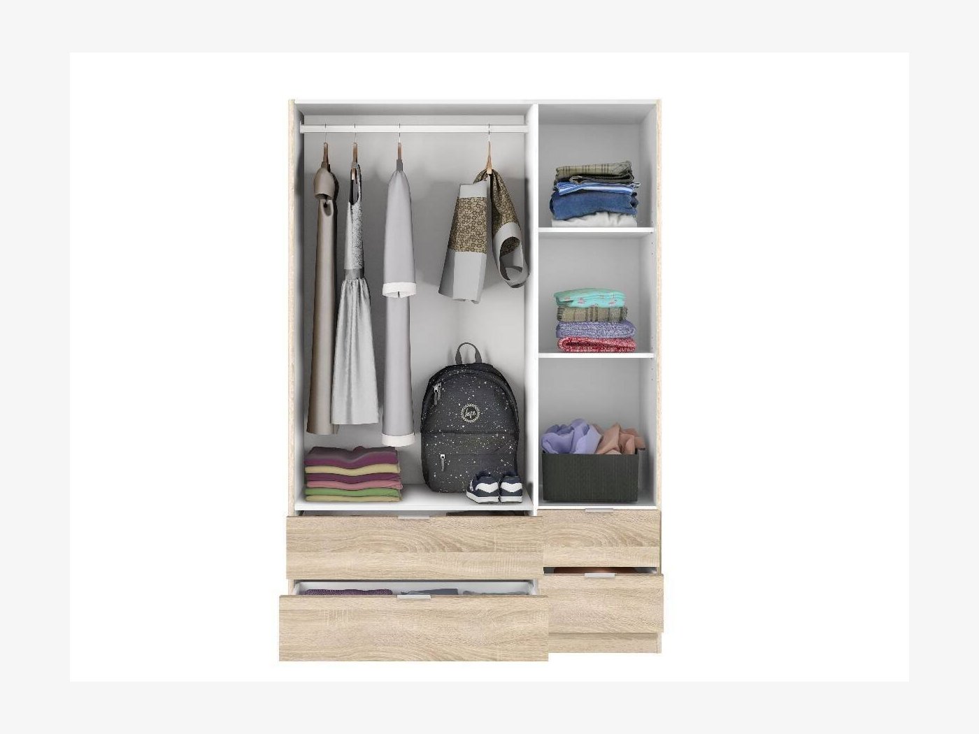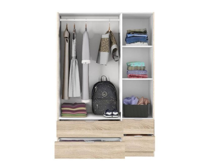 Este modelo de armario dispone de 3 estantes interiores en la puerta lateral derecha, que puedes destinar para guardar todo tipo de complementos, camisetas o pantalones. Cuenta con 4 cajones en la parte inferior central accesibles desde el exterior, sin tener que abrir las puertas. Son ideales para ordenar las prendas pequeñas, como por ejemplo ropa interior, bufandas, guantes, pañuelos...