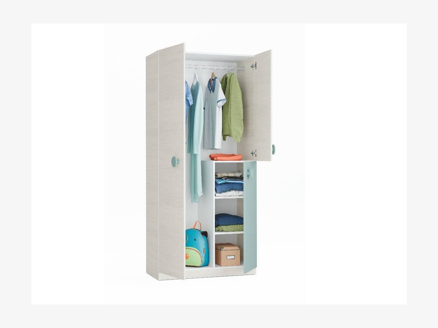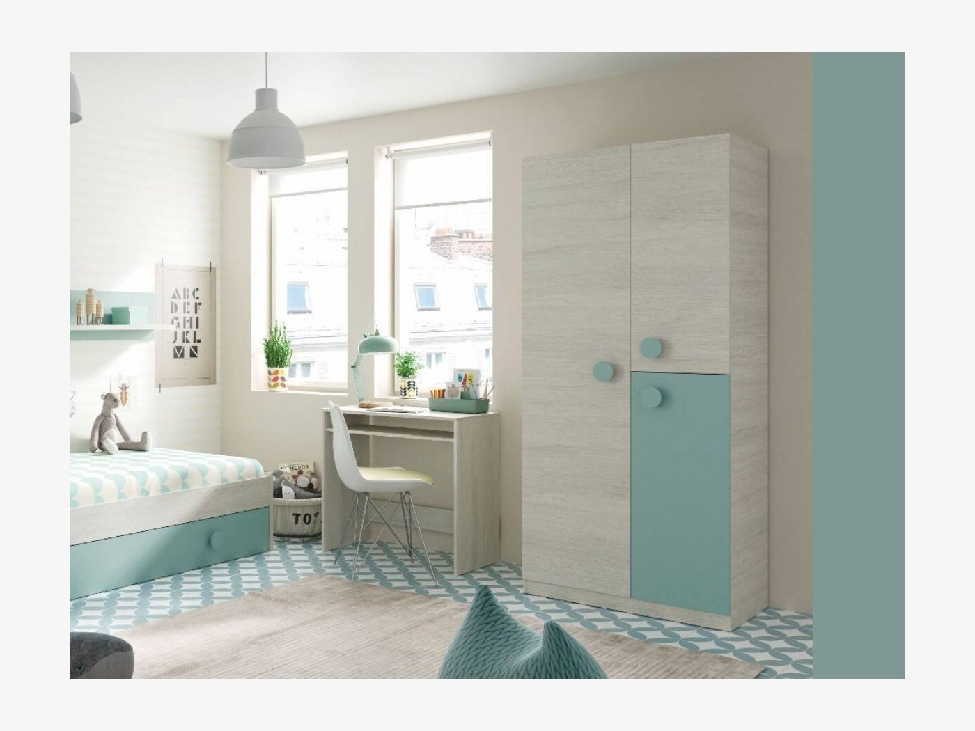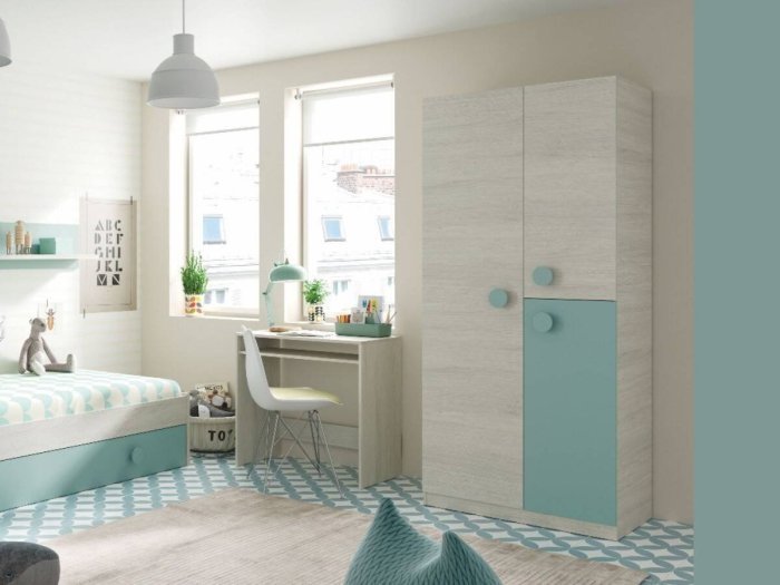 Fíjate en este armario juvenil para dormitorio con tres puertas, en tonos neutros y verde. Perfecto para habitaciones adolescentes.