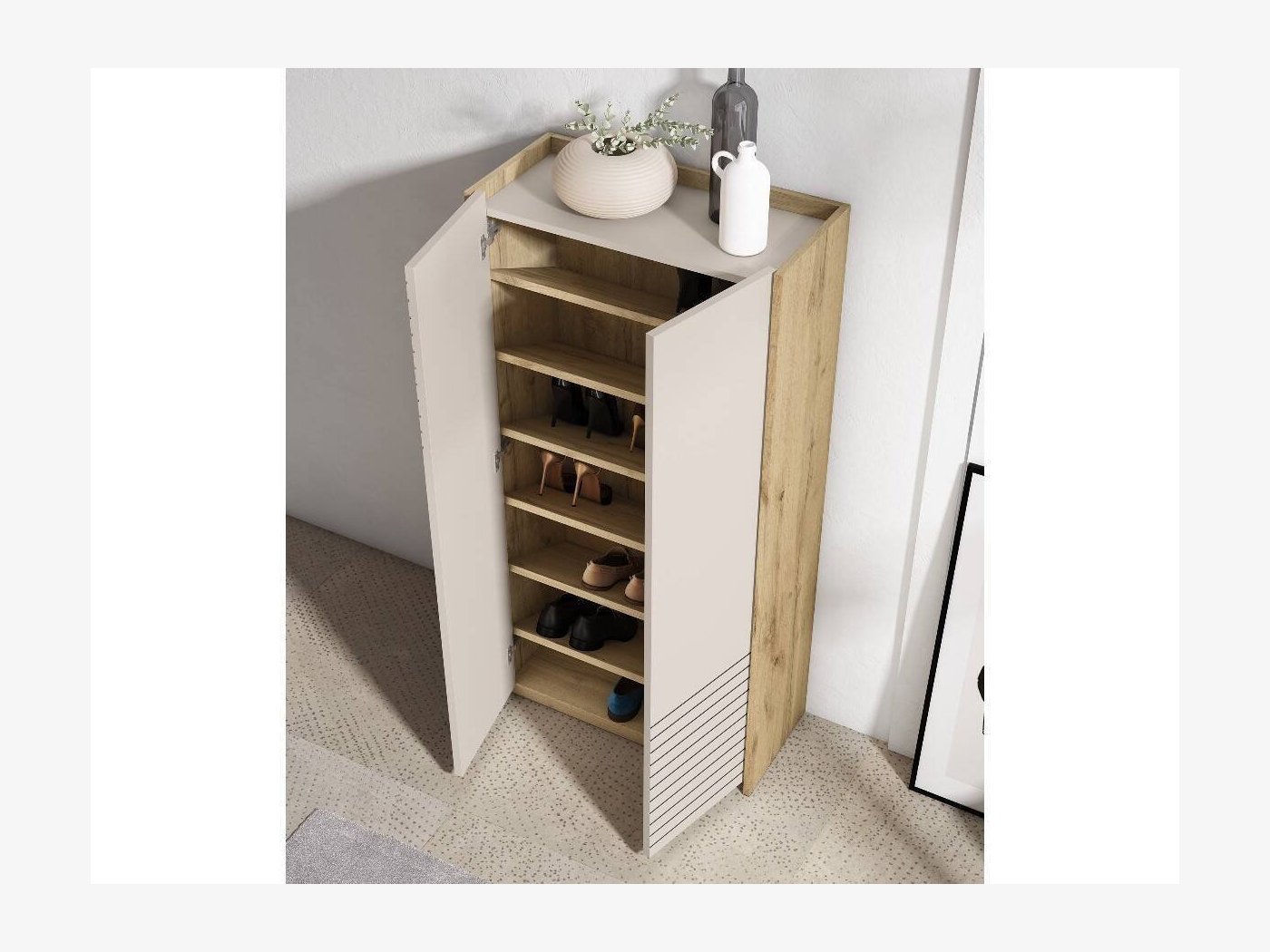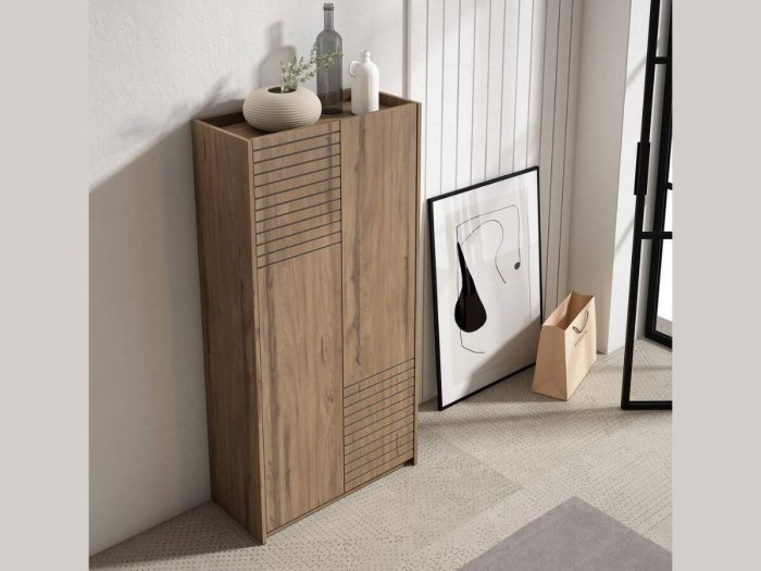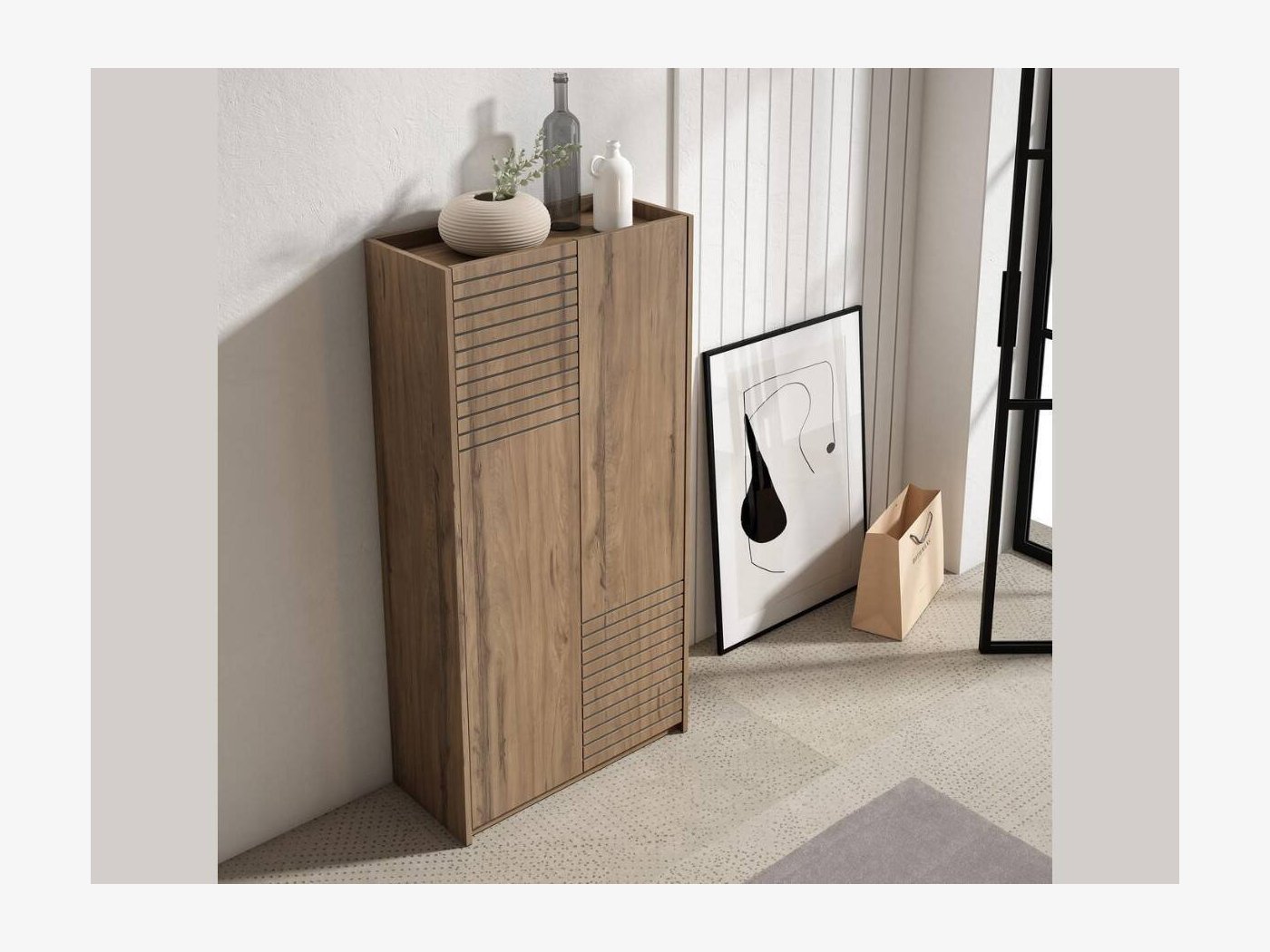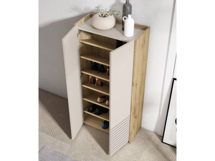 El zapatero Footer es un armario de lineas rectas con capacidad aproximada para 18 pares de zapatos. Tiene dos puertas para abrir y cerrar el armario, lo que permite un fácil acceso al contenido. Es ideal para mantener los zapatos ordenados y protegidos del polvo y la humedad. Además, ayudan a mantener el espacio ordenado y libre de desorden.