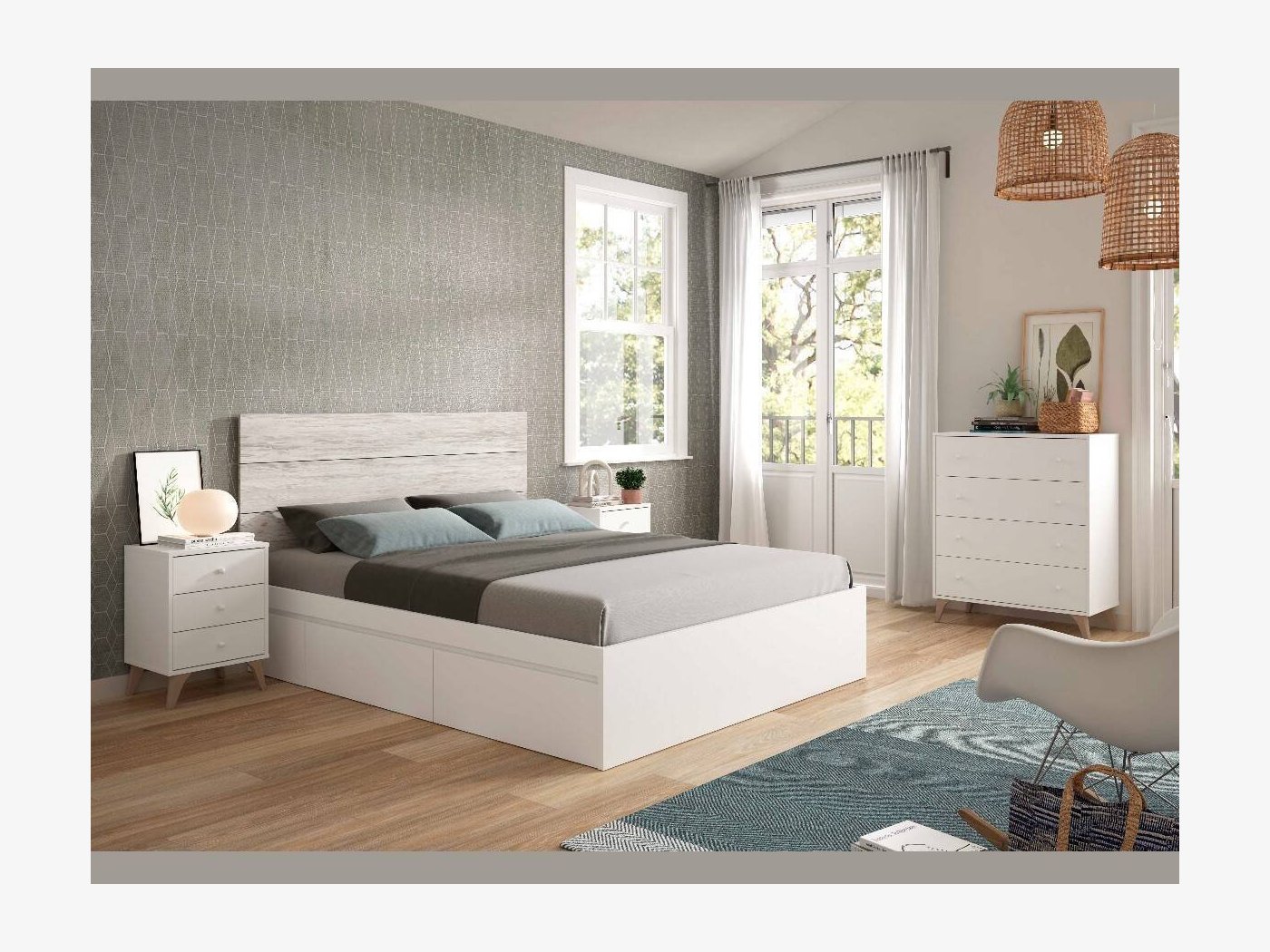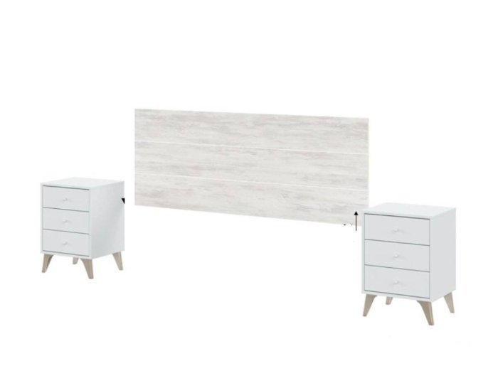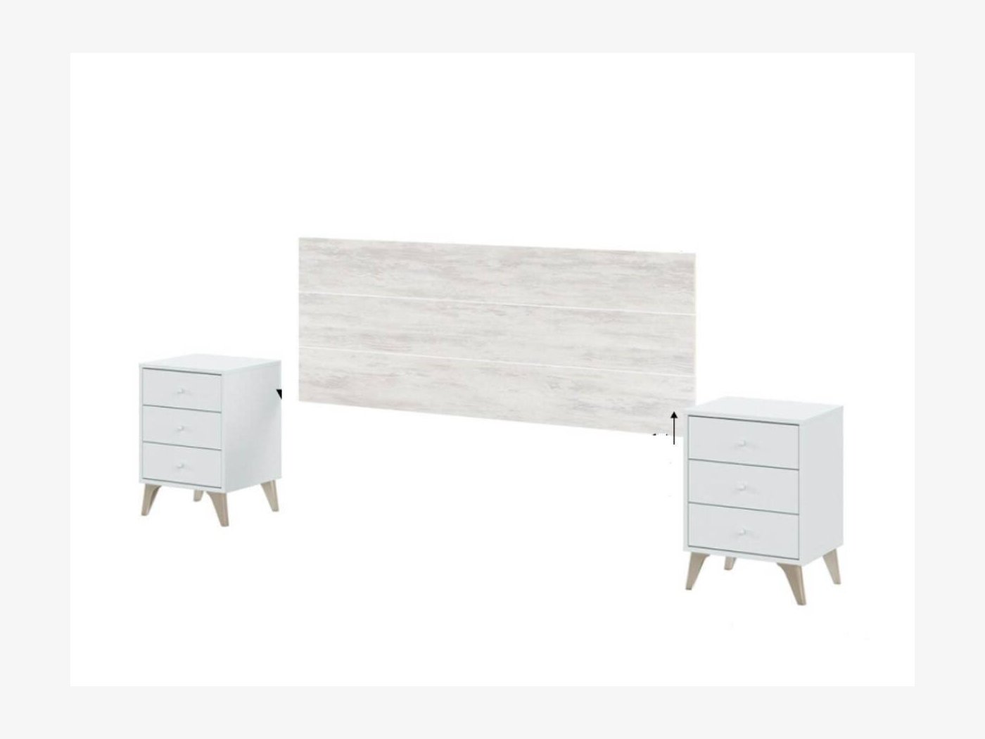 El dormitorio de matrimonio Romantic está formado por un cabecero colgado y 2 mesitas de 3 cajones, perfectas para almacenar todo aquello que necesites. Disponible en blanco veta combinado con color roble decapado.