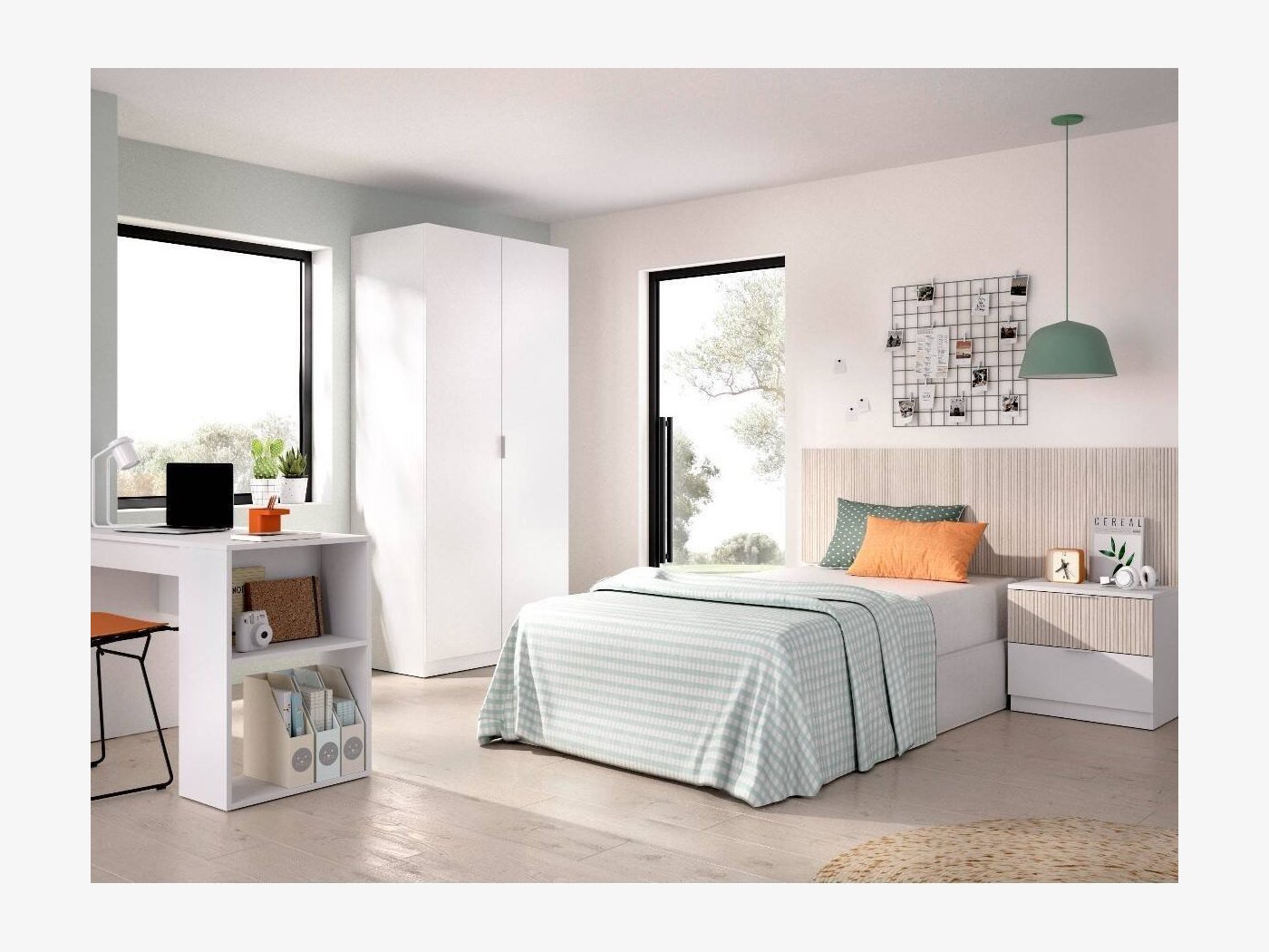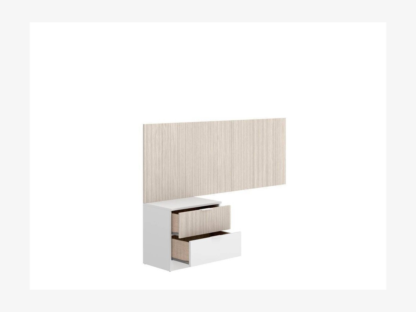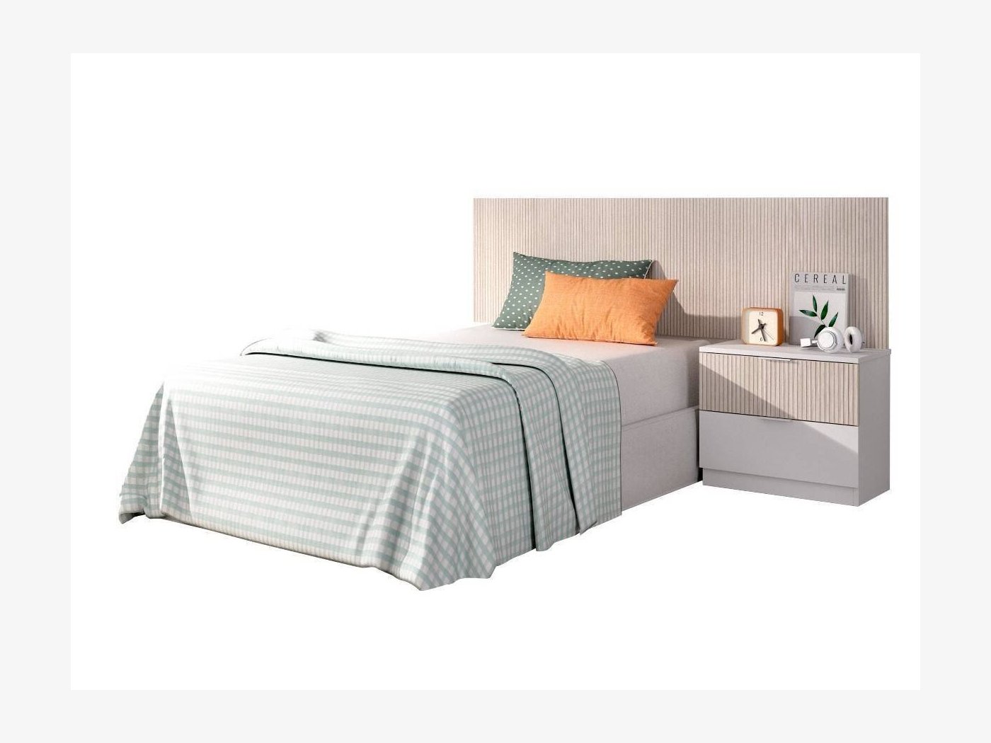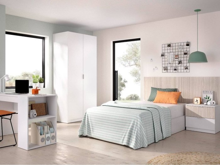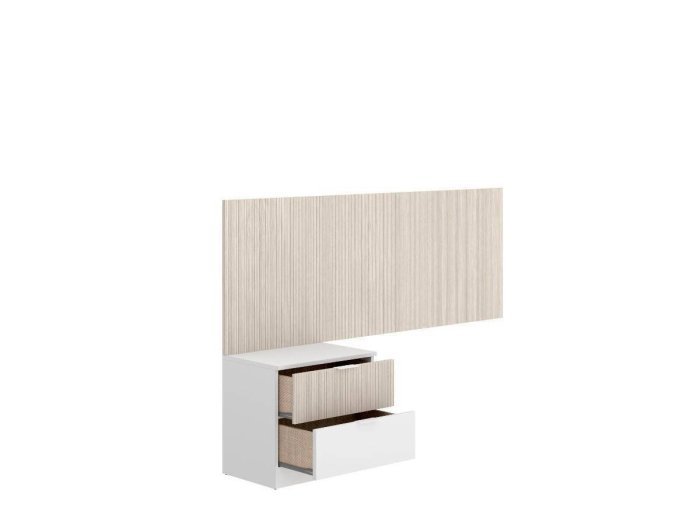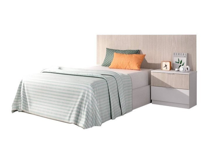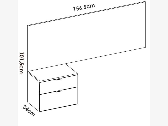 Conjunto formado por un cabecero mural y mesita de 2 cajones. El cabezal se adapta perfectamente a un canapé y la altura de 60 cm permite colocar un cojín de apoyo para leer o ver la tv desde la cama cómodamente.
