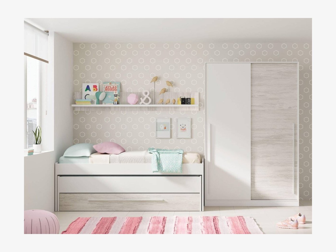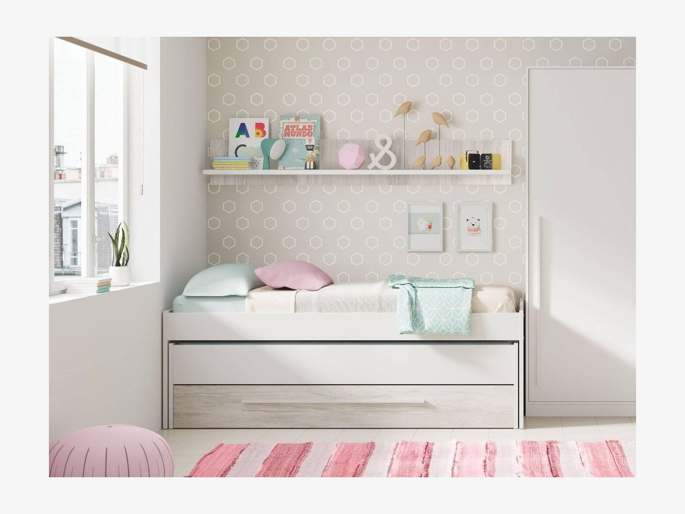 Conjunto de cama doble desplazable y cajón inferior que se complementa con estanteria superior. Dos piezas muy útiles para la habitación de tus hijos.