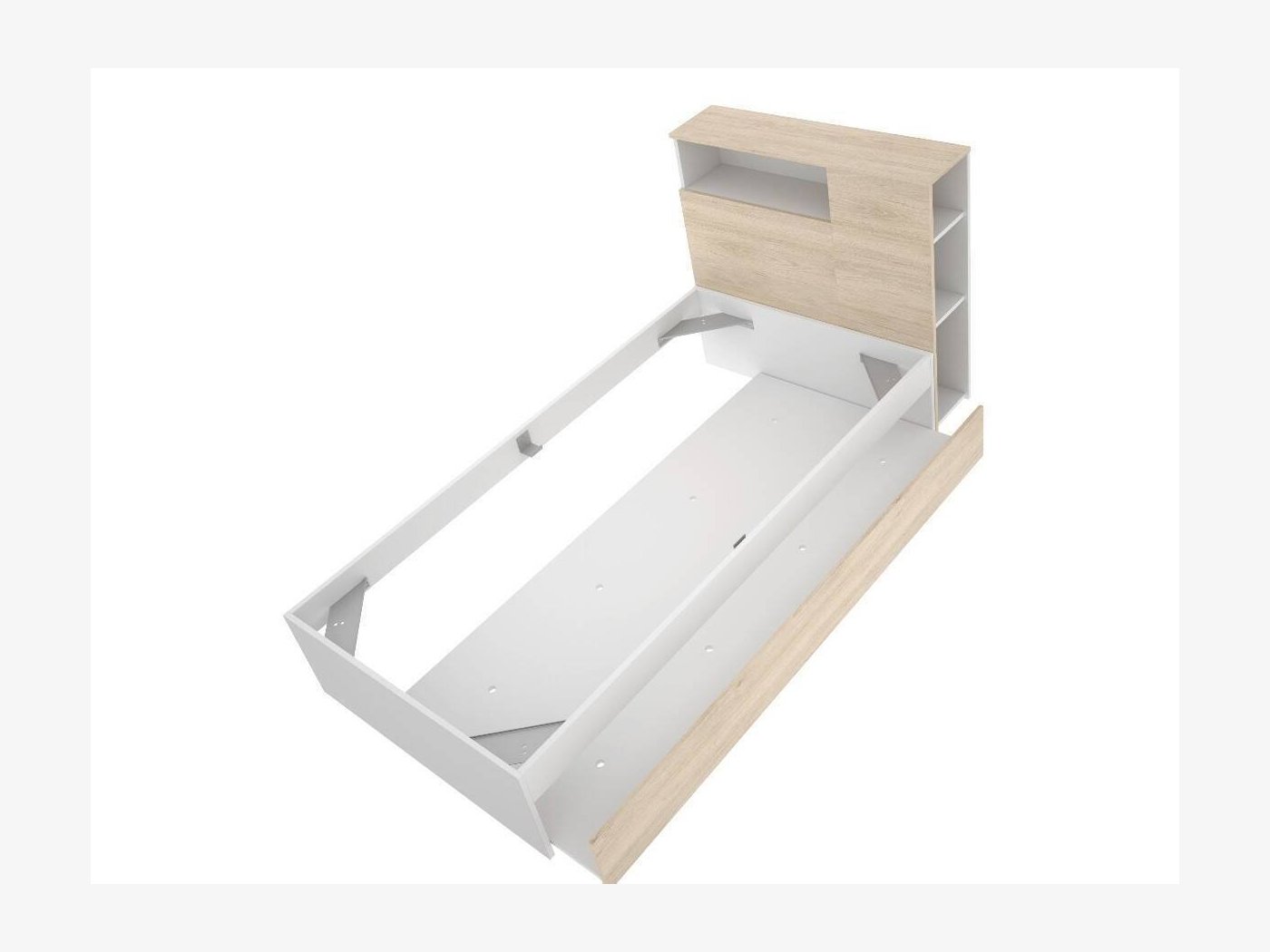 El cabecero dipone de un hueco central como espacio de mesita y una estructura lateral de estantería para poder colocar libros, objetos de decoración u otros complementos.