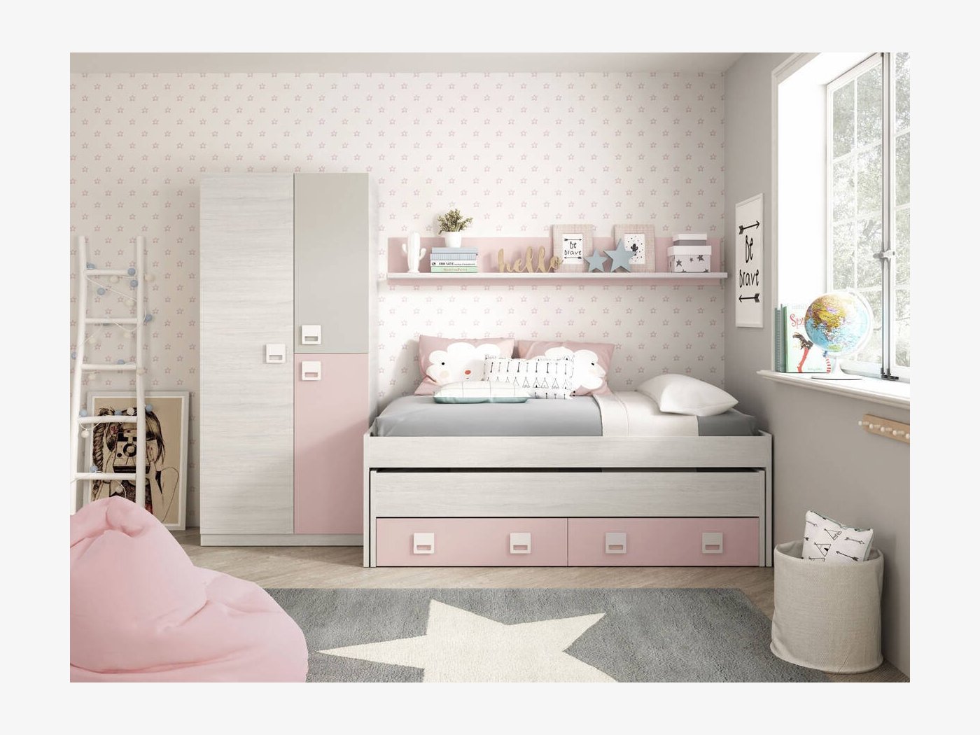 Conjunto de cama doble desplazable y cama nido inferior que se complementa con dos cajones inferiores. Añade además estanteria superior, un elemento auxiliar de almacenaje.
