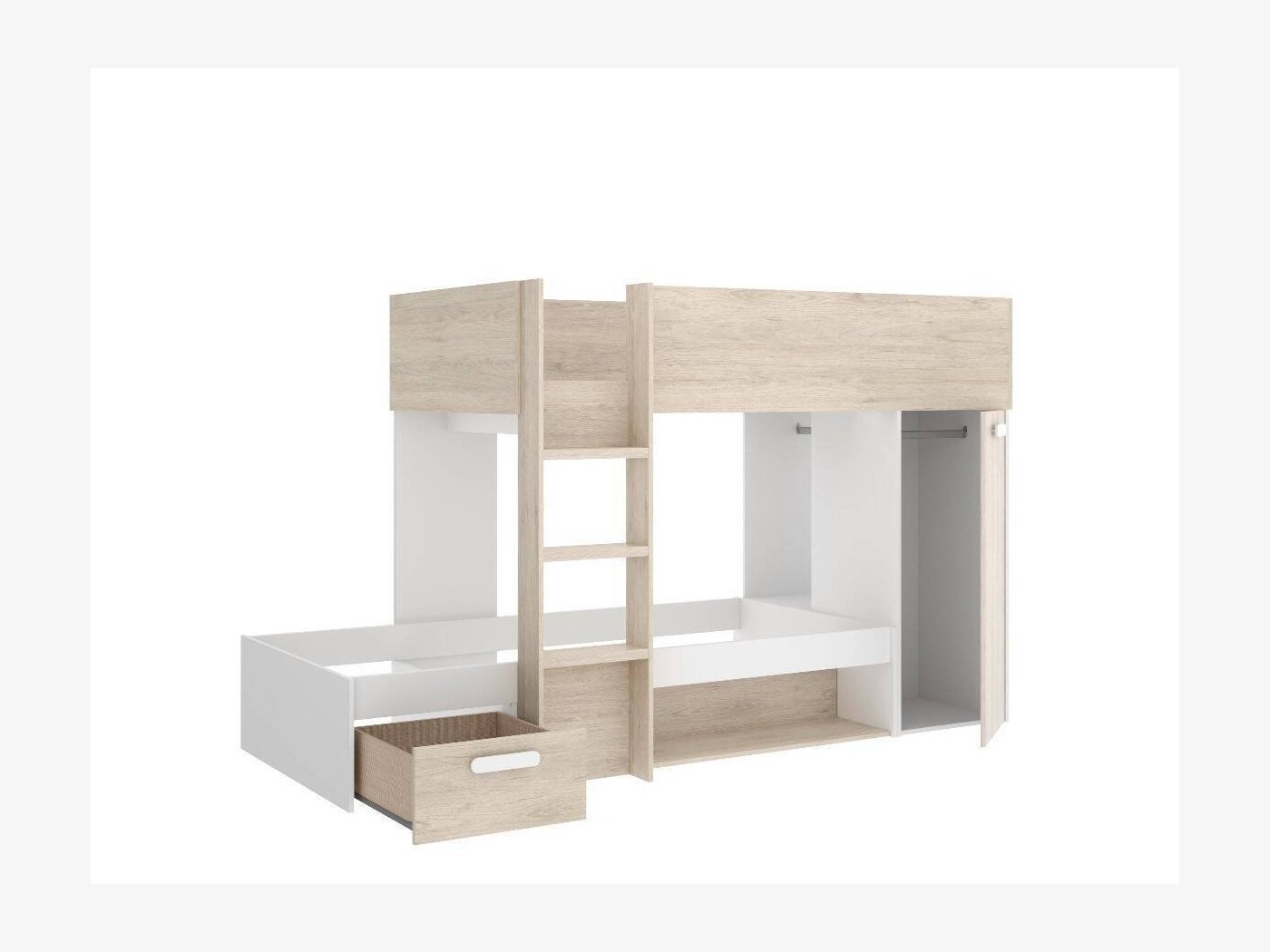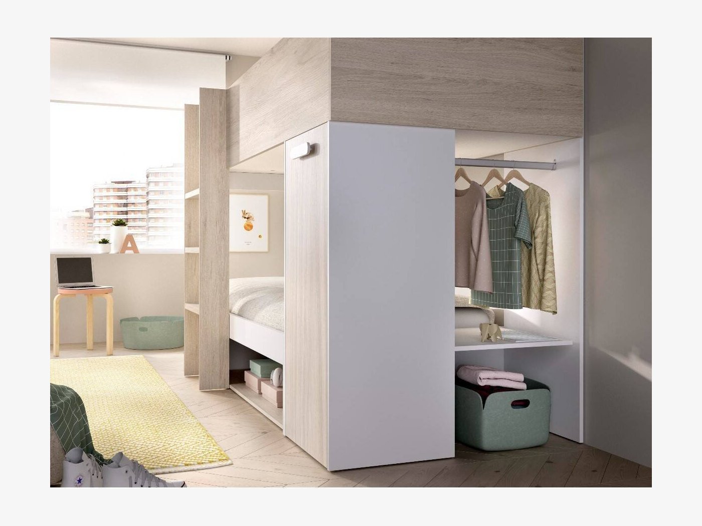 Además de las dos camas, tiene un armario con barra y estante, un espacio abierto con barra, y cajón y hueco en la parte inferior; por lo que contamos con suficiente espacio de almacenamiento