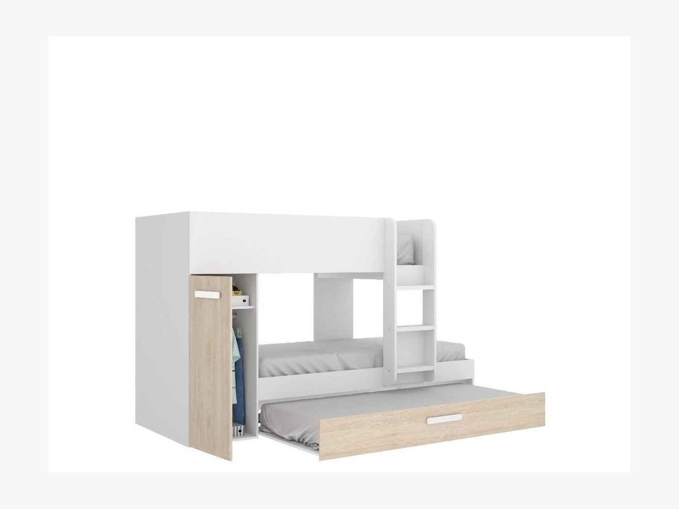Además de las tres camas, tiene un armario con barra y estante, por lo que contamos con suficiente espacio de almacenamiento
