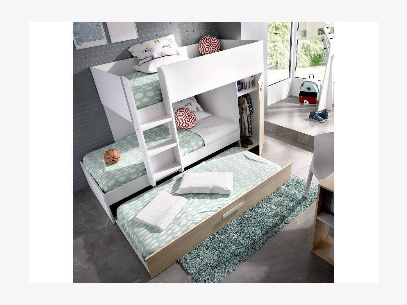 La cama tren con tres camas es ideal para dos niños, con posibilidad de alojar a un tercero en casa de necesidad. Es la solución perfecta para habitaciones con espacio limitado.