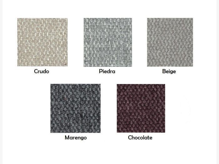 Tapizado en tela tipo chenilla de tacto suave. Hilo contrastado. Composición 100% Polyester. Resistente al agua. Asientos y respaldos desenfundables.
