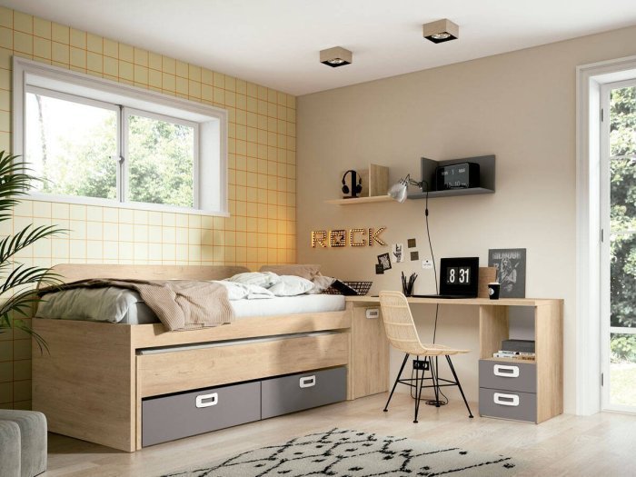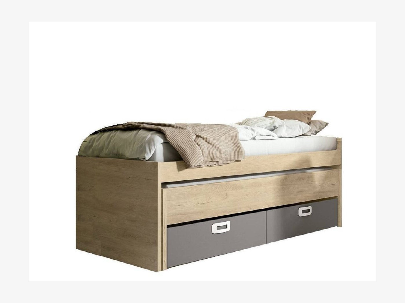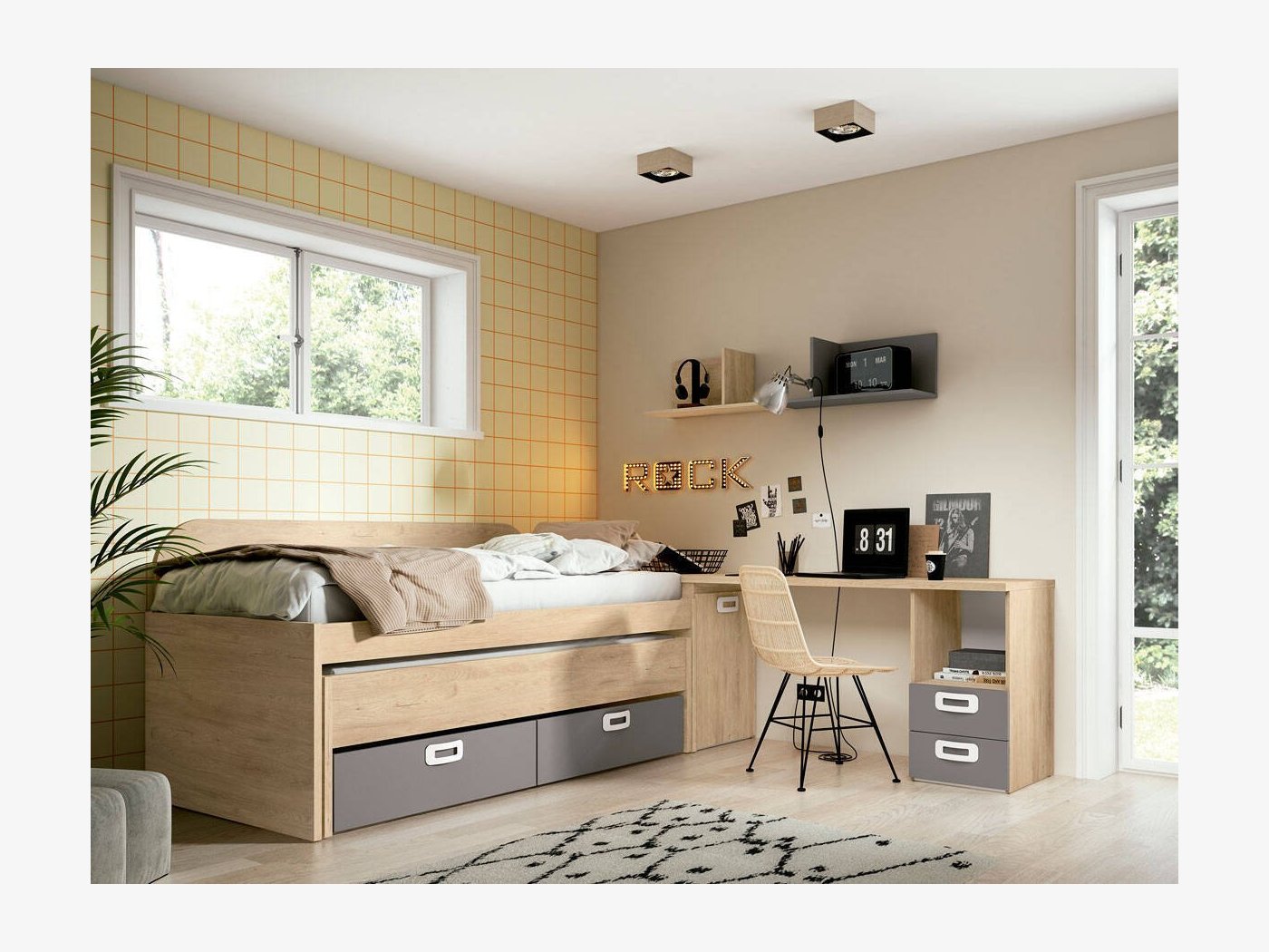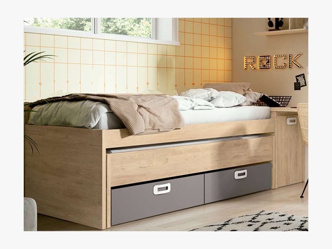 Cama doble compacta de cantos rectos con nido inferior desplazable y 2 cajones. Varios colores a elegir.