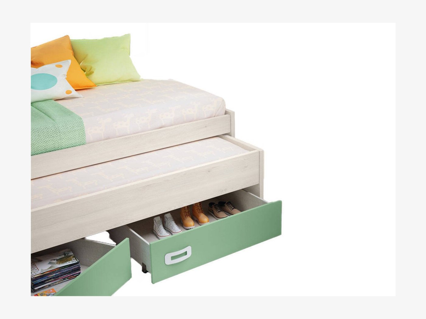 Cama inferior desplazable con ruedas y reversible: oculta por frontal de madera o visible con larguero..Precisa somier y colchón de 90x190 cm. Altura máxima colchón inferior 17 cm.