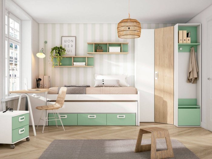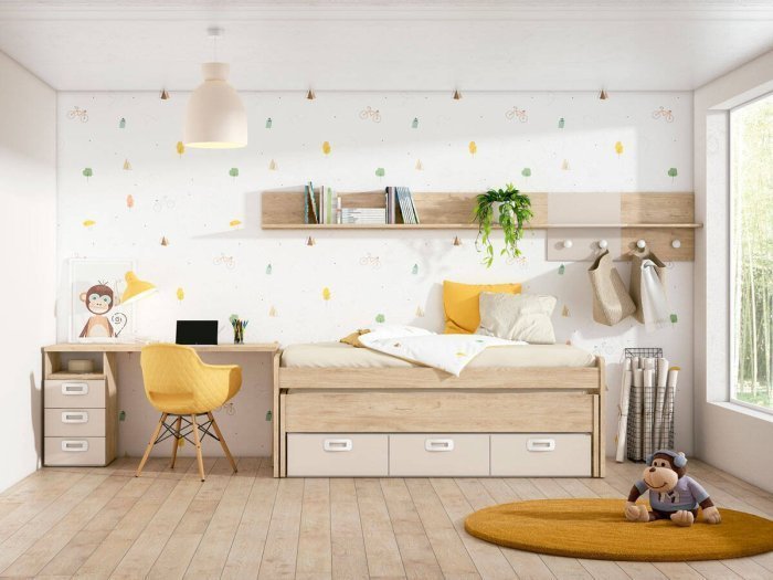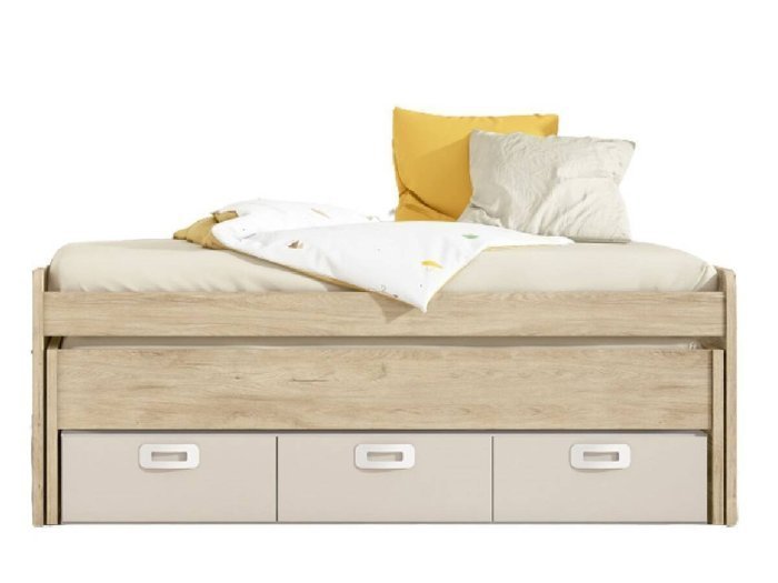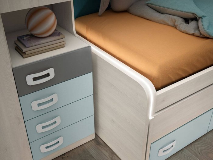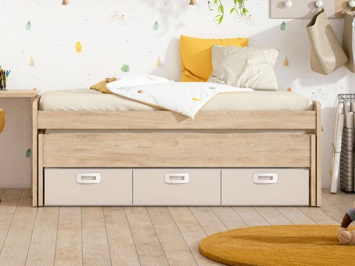 Cama inferior desplazable con ruedas y reversible: oculta por frontal de madera o visible con larguero. Precisa somier y colchón de 90x190 cm. Altura máxima colchón inferior 17 cm.