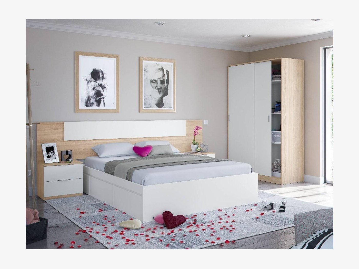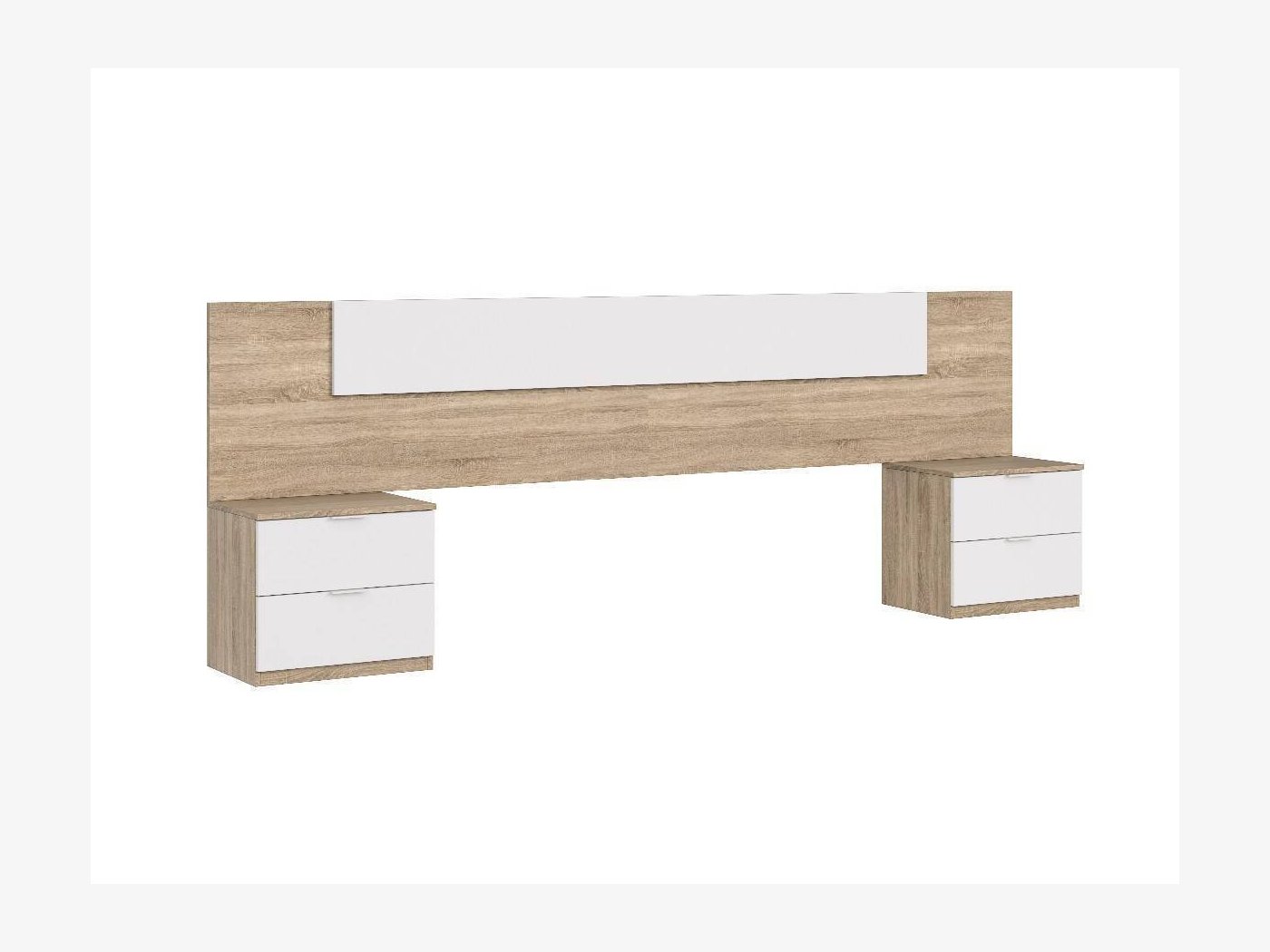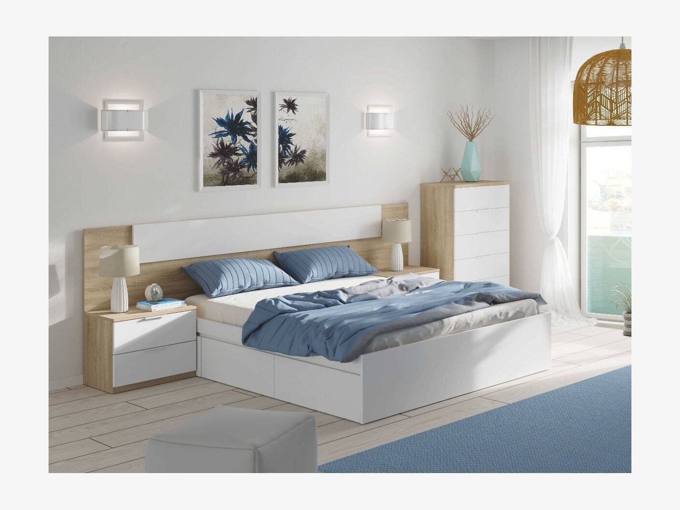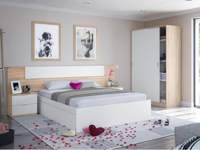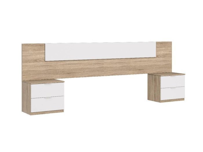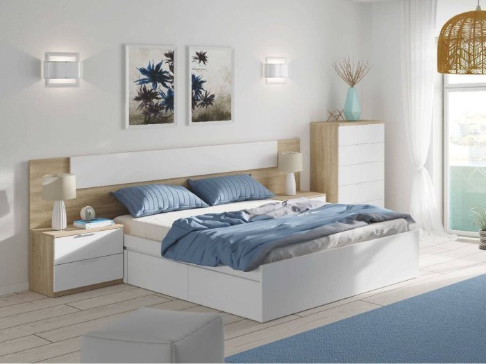 El dormitorio modelo Villaverde cuenta con un cabezal de gran tamaño que ofrece en la parte central un rectángulo en color blanco. Incluye también las dos mesitas de dos cajones.