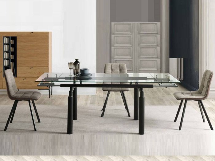 Mesa con 2 extensibles laterales por debajo que se elevan a la altura de la encimera.Cristal templado de 12mm, estructura metálica y patas cilindricas en negro mate.