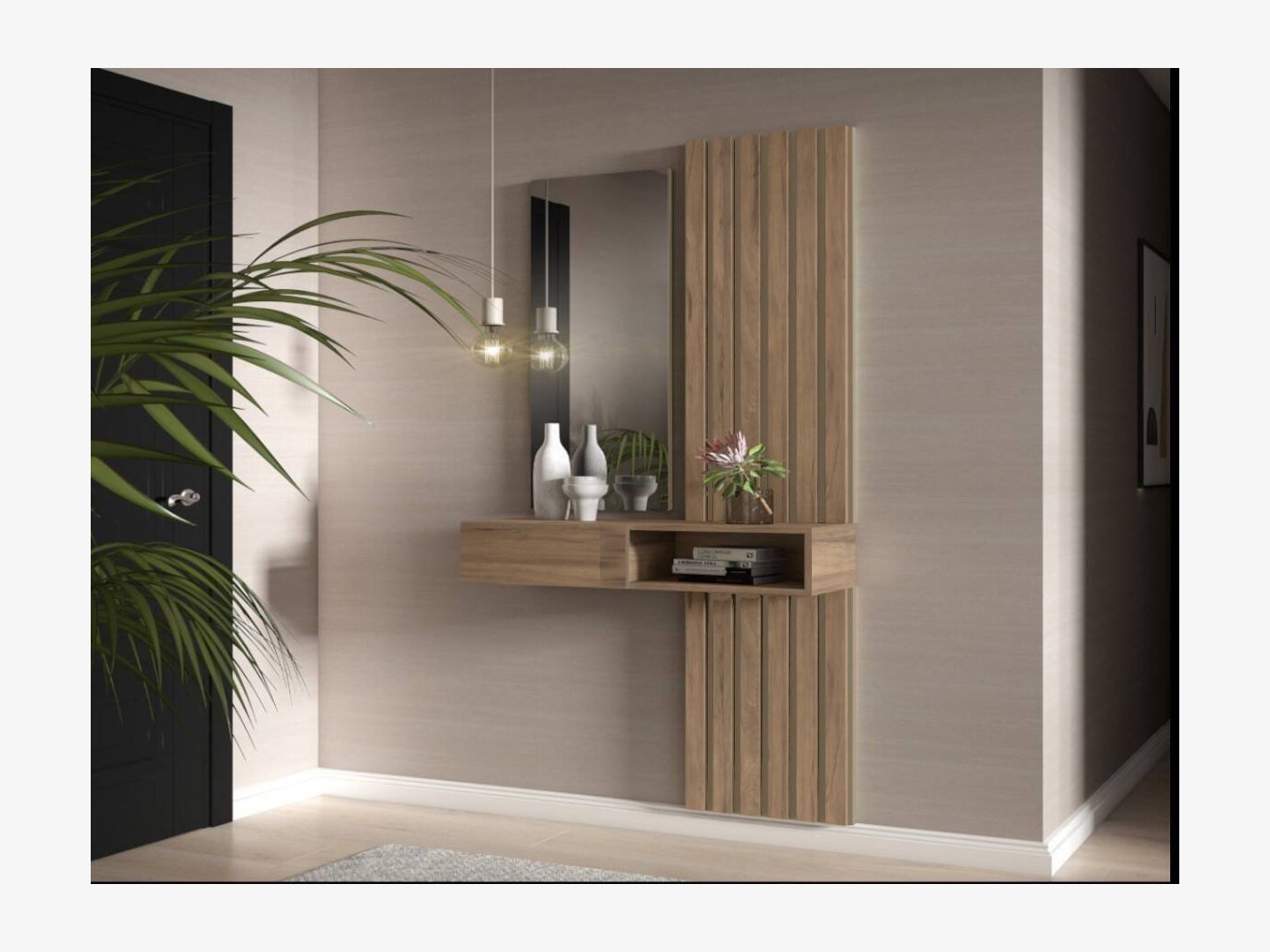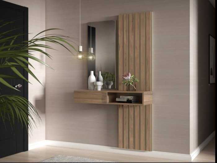 Un mueble consola recibidor con paneles y listones de madera es una excelente opción para darle un toque elegante y funcional a la entrada de tu hogar. Este tipo de mueble suele ser estrecho y alargado, perfecto para colocarlo en espacios reducidos como pasillos o vestíbulos.