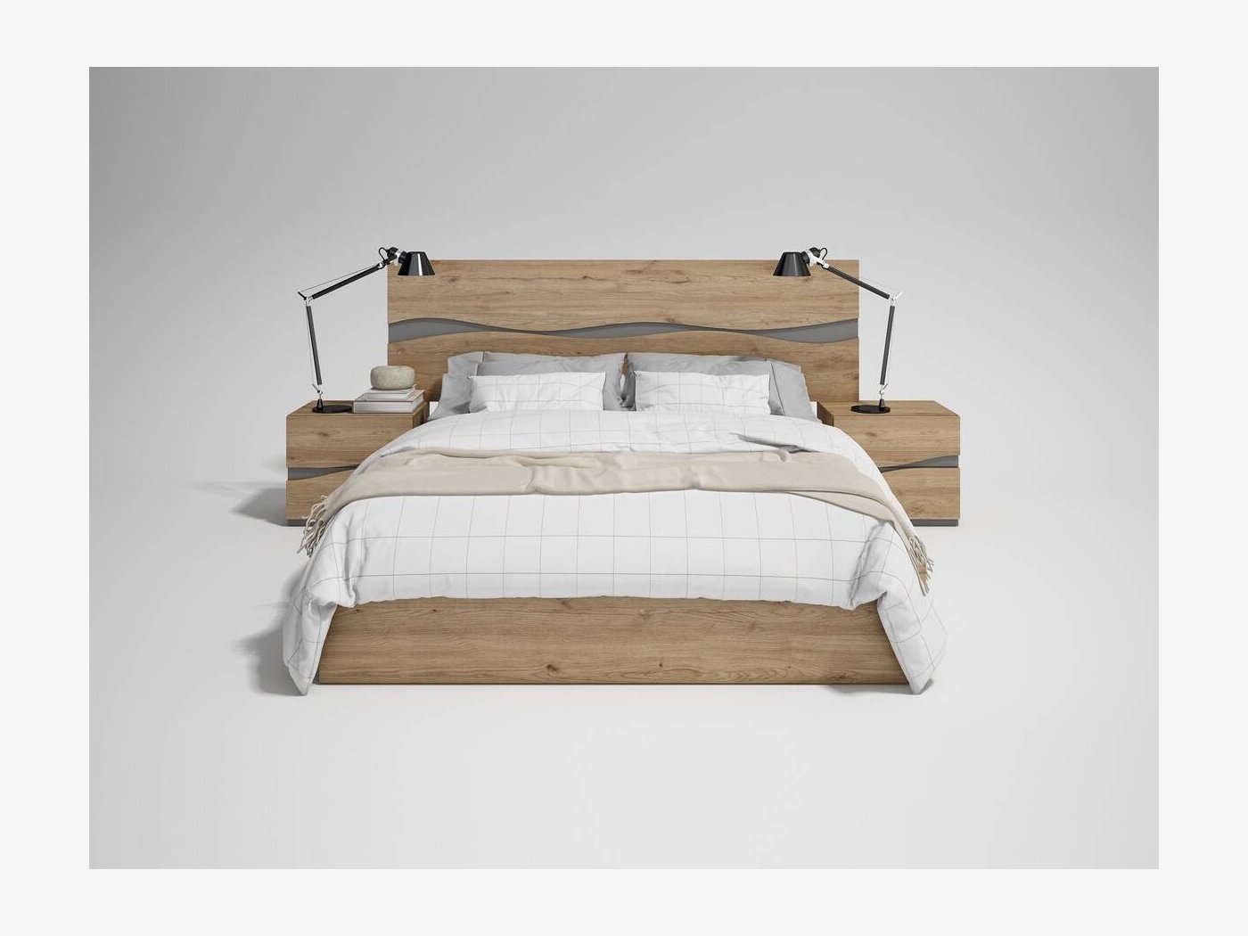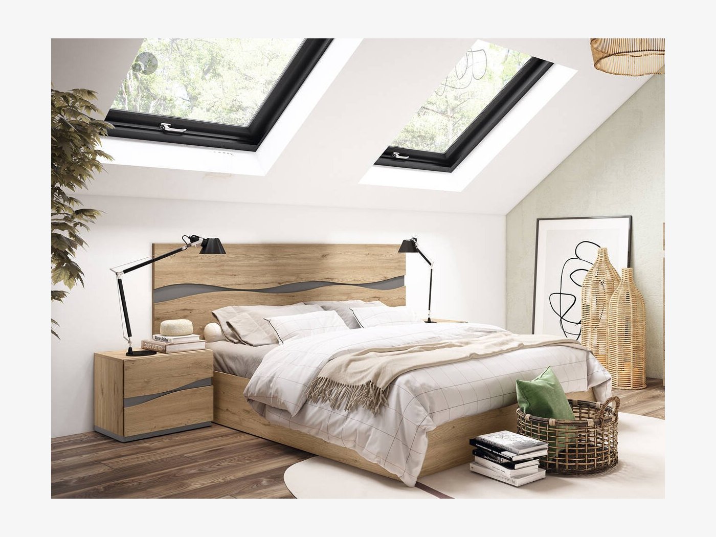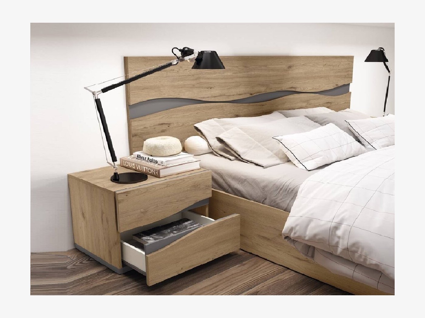 El dormitorio Fredi dibuja una linea ondulada en color gris a lo largo de todo el cabezal y mesitas. Un mueble actual que añade además capacidad de almacenaje, gracias al canapé abatible.
