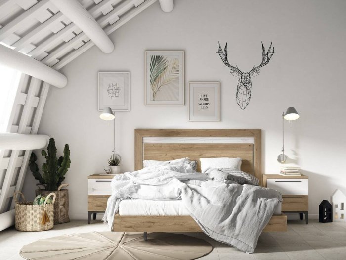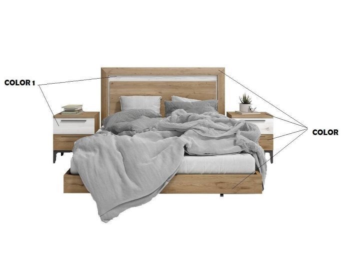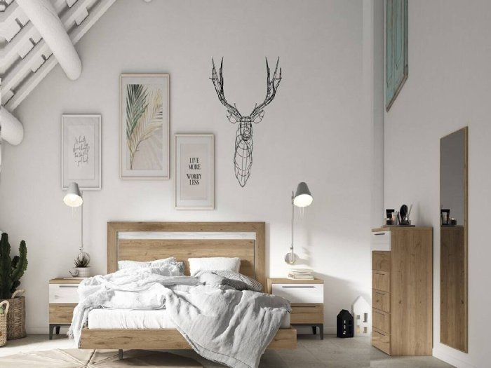 El dormitorio Vinté se caracteriza por tener un diseño de formas geométricas en los distintos plafones superpuestos del cabezal. Las mesitas, con cajones rectangulares, descansan sobre un marco con terminal en patas cónicas.