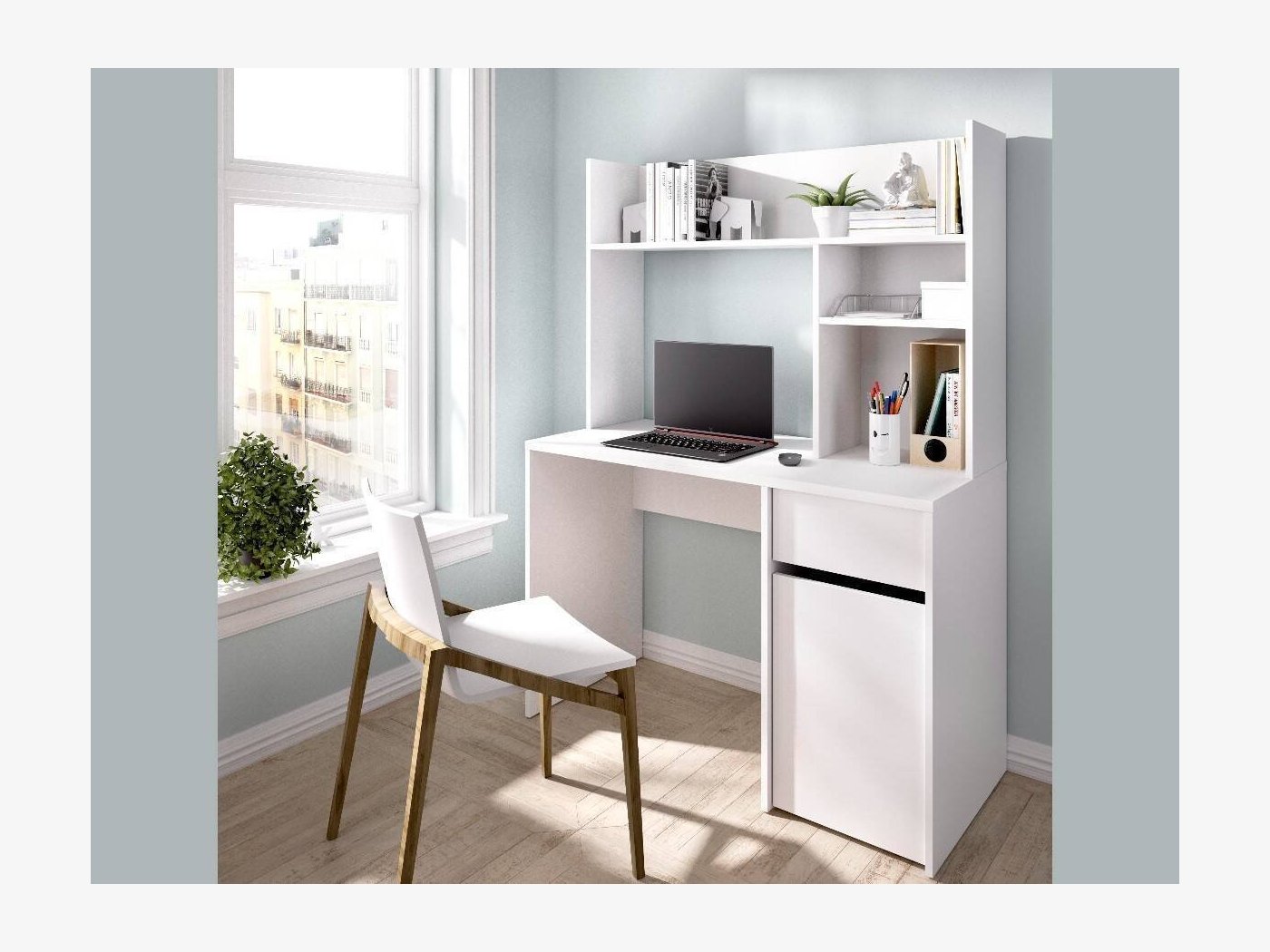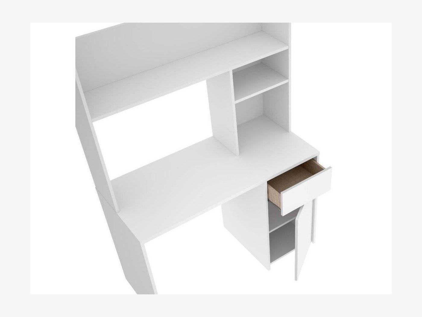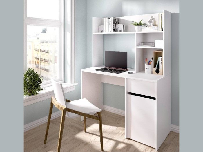 Equipado con un altillo con superfície de almacenaje para libros u otros complementos.