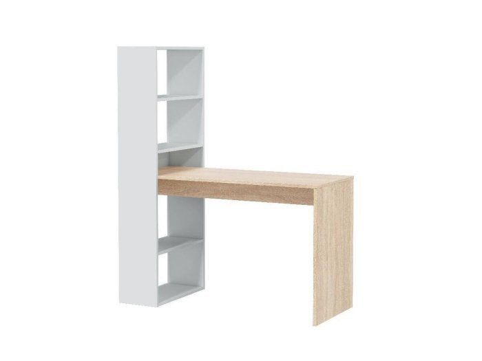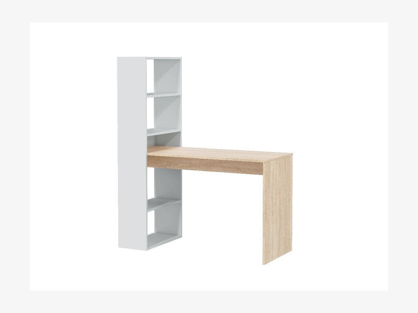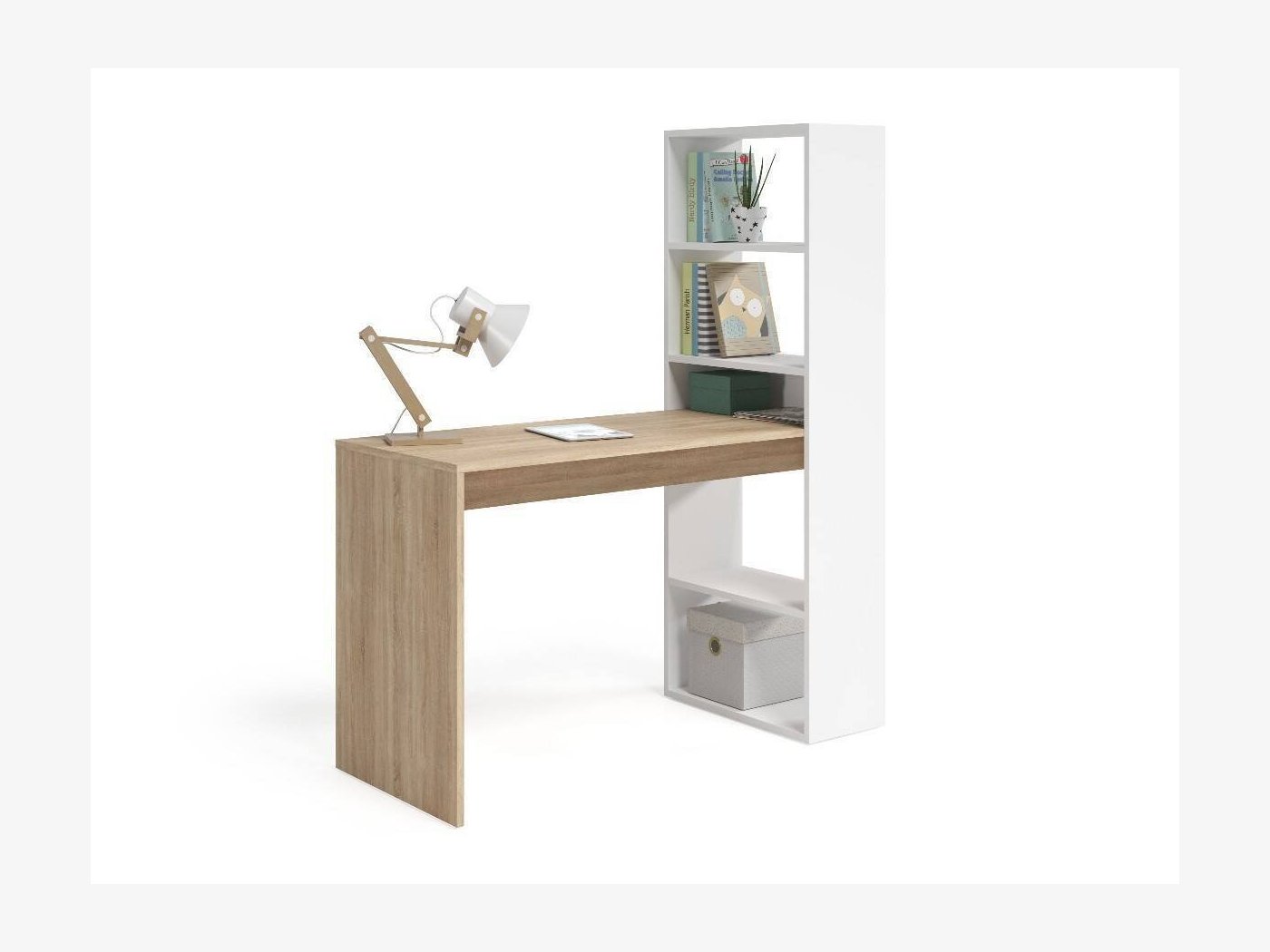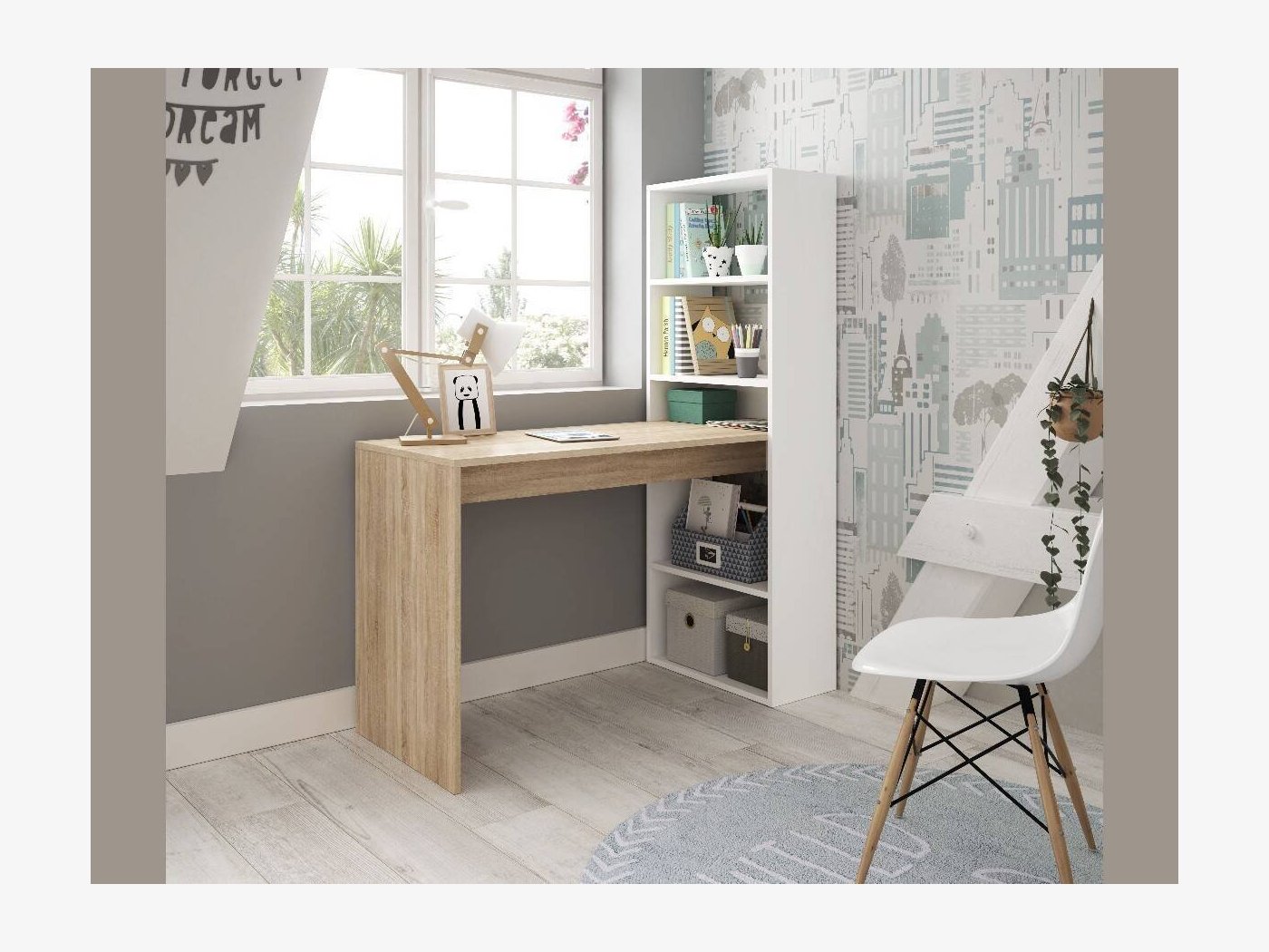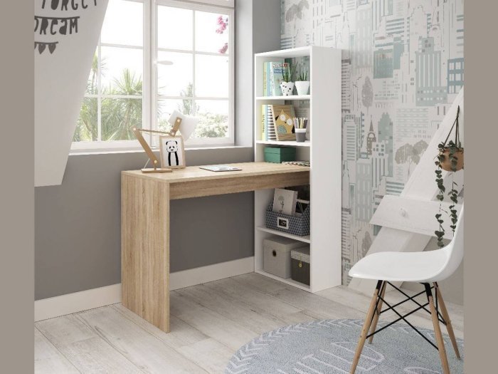 El modelo Roy es un escritorio con estantería integrada que puedes montar tanto con la estantería a la izquierda como a la derecha. Es fácil de combinar en cualquier ambiente y decoración y cuenta con 5 huecos amplios.