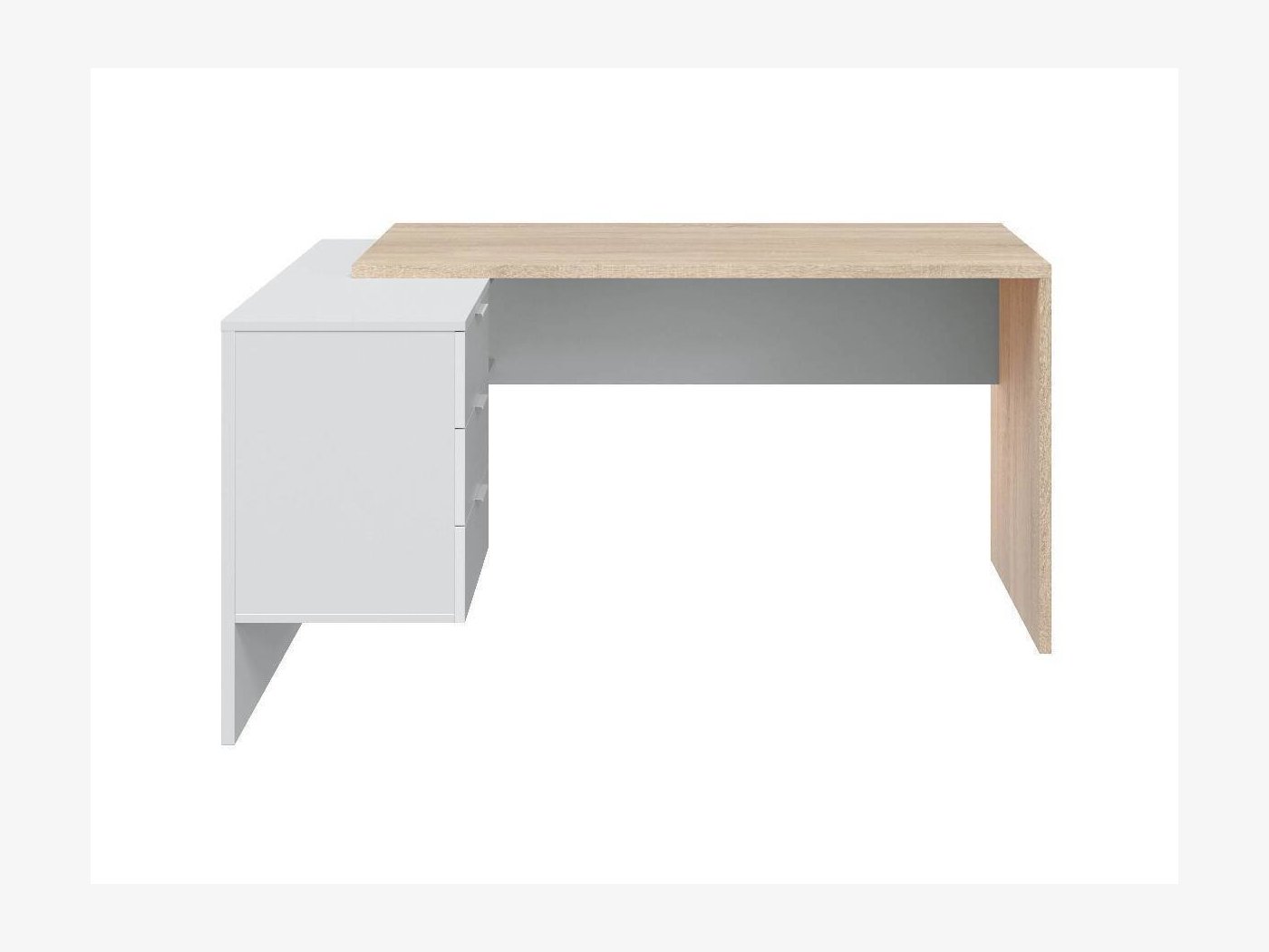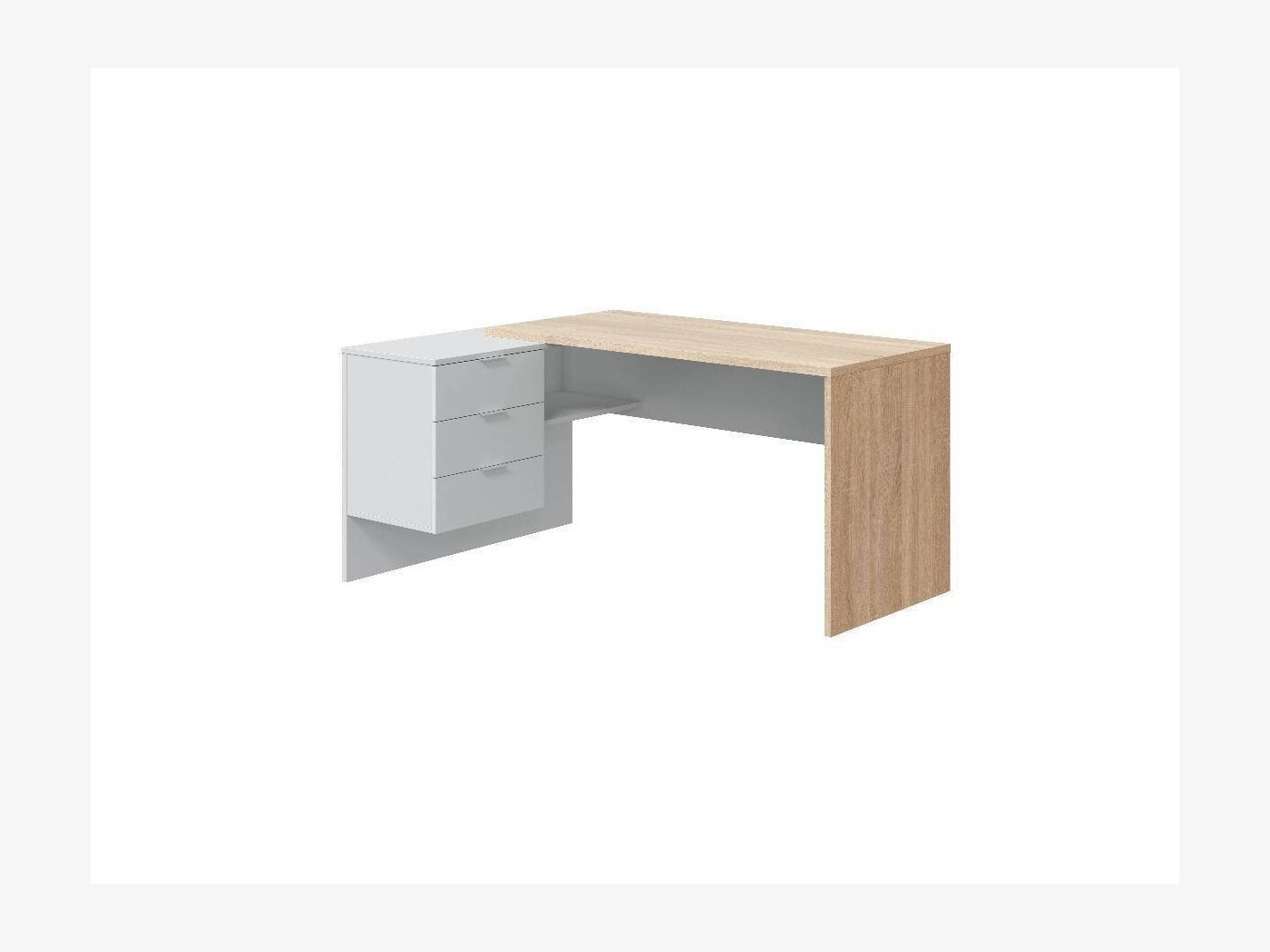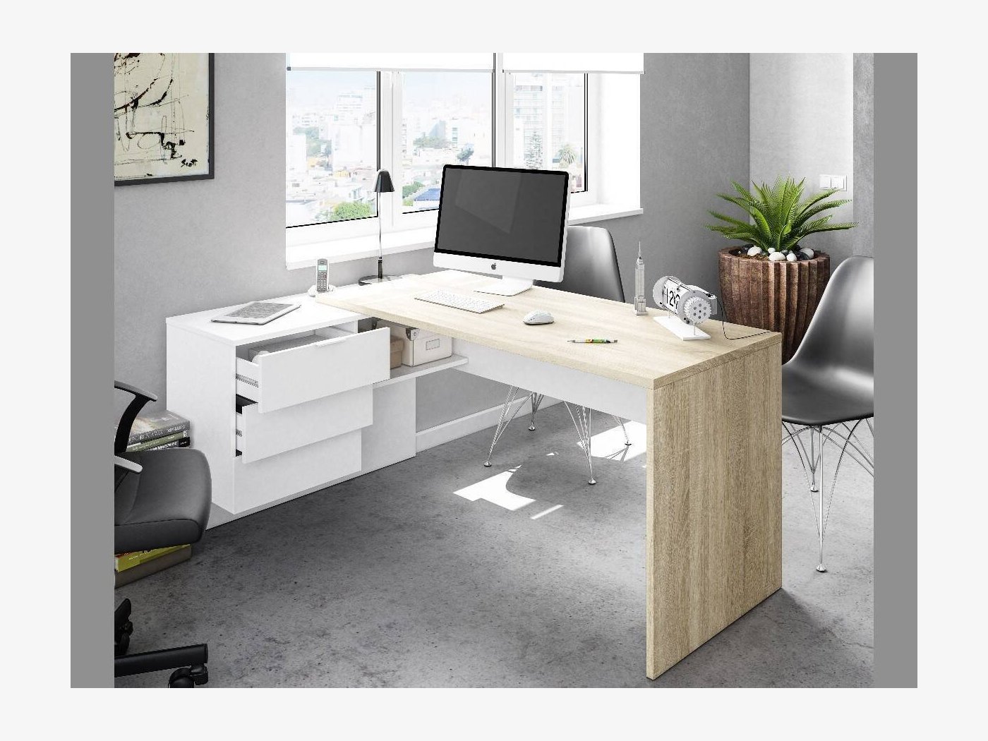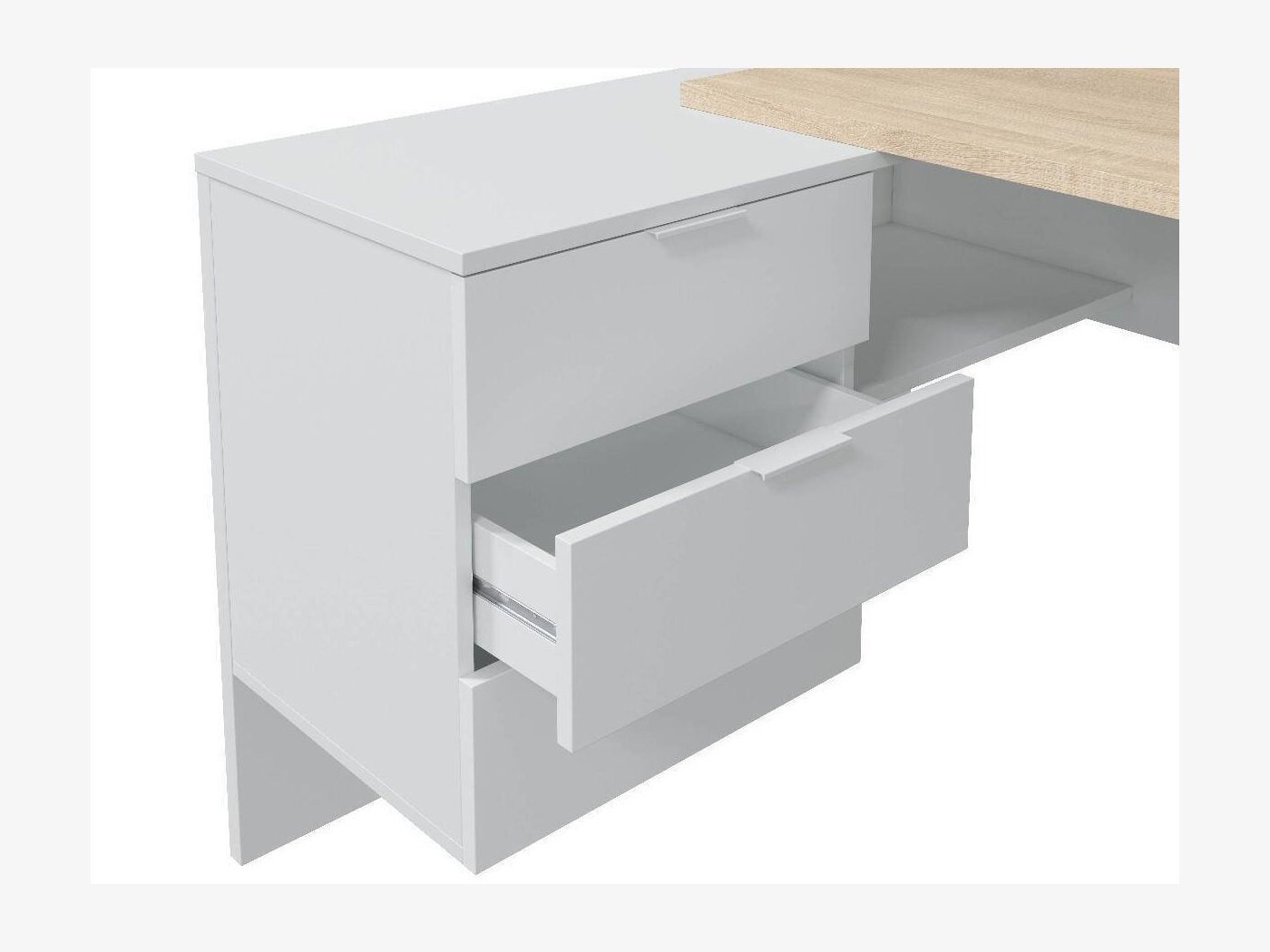 Escritorio en forma de L con cajonera, ideal para home office o zona de estudio. Disponible en color roble combinado blanco, con posibilidad de color car el buc a derecha o izquierda.