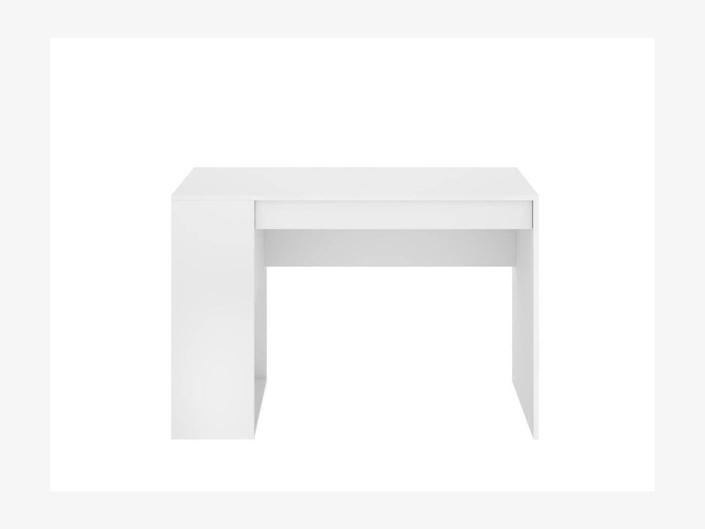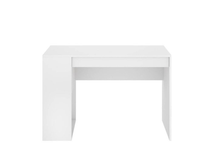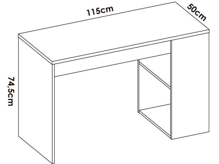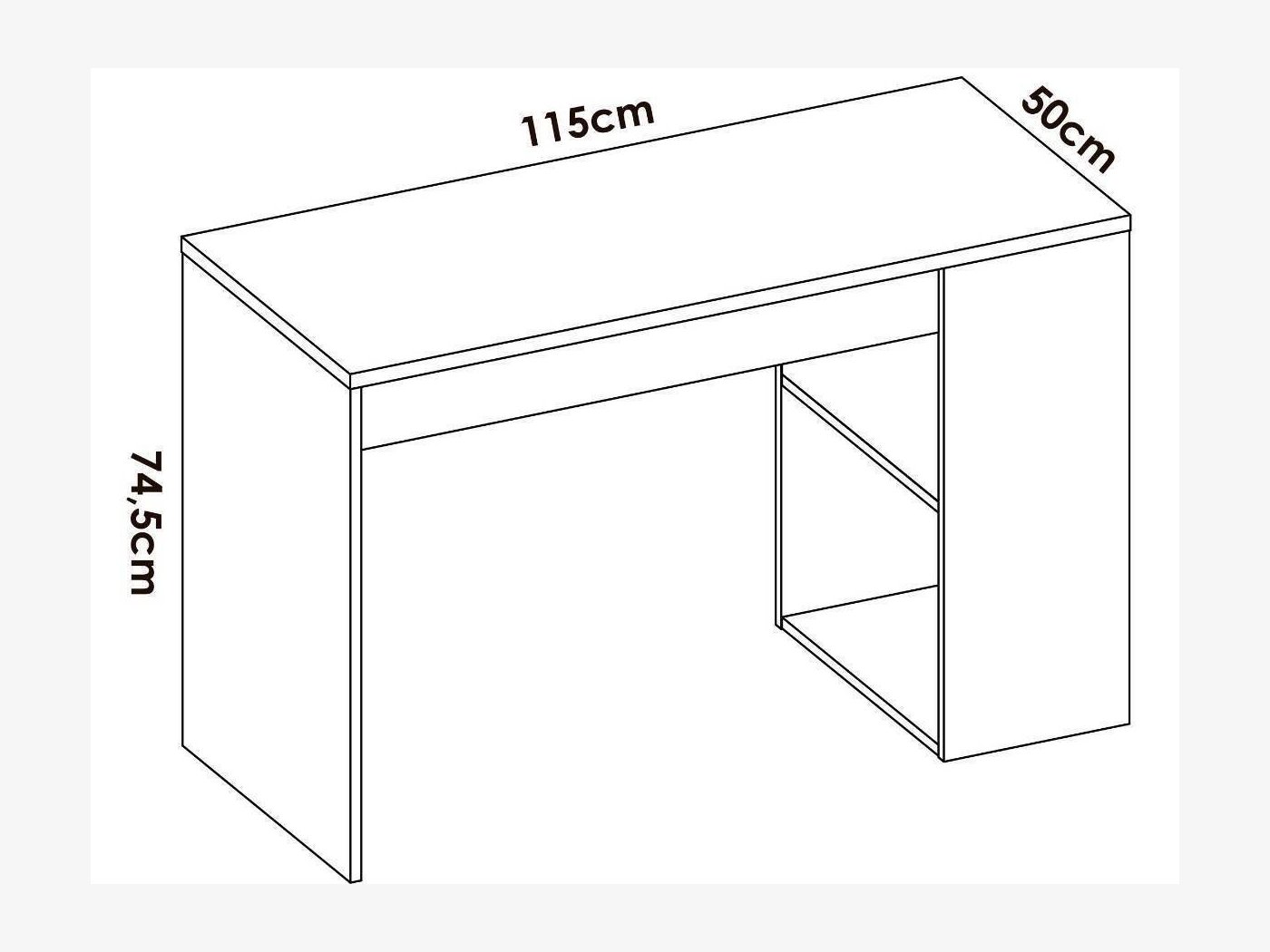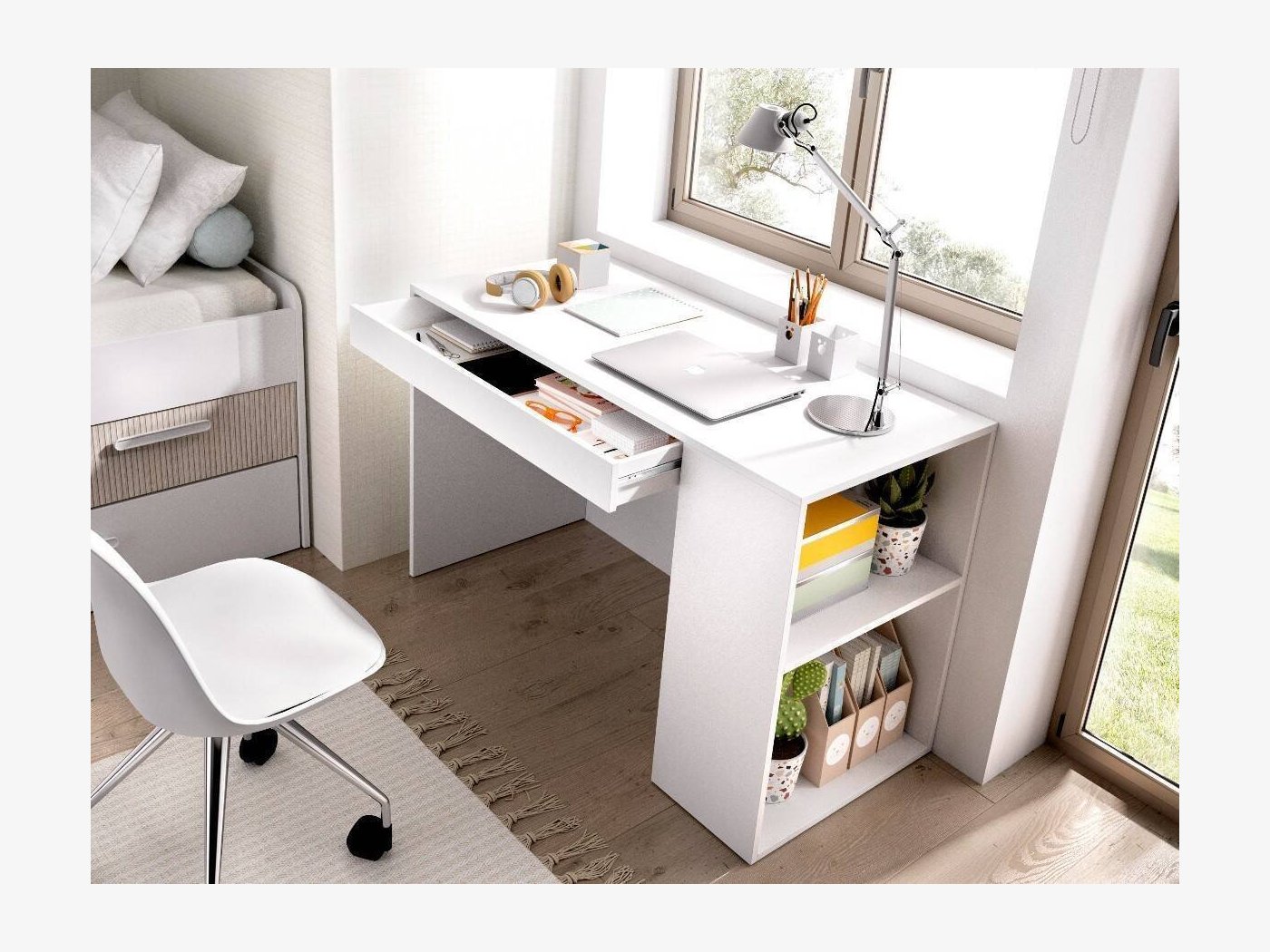 Formada por una mesa de 115 cm que se combina con una estanteria lateral de almacenaje y un cajón extraíble inferior.
