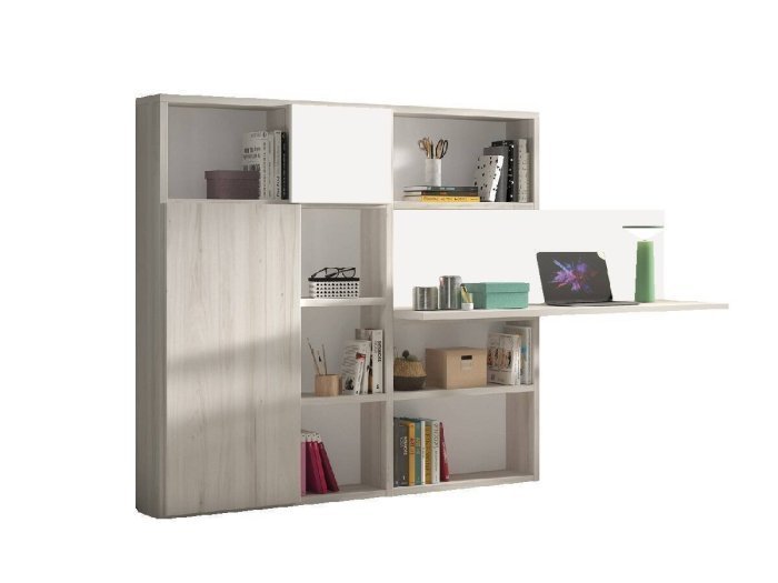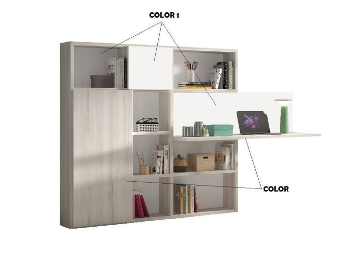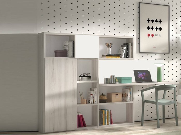 Esta propuesta está formada por un escritorio de 200x55 cm y 3 cuerpos de estantería de 75,35 y 45 cm