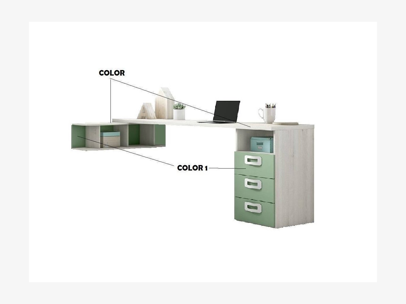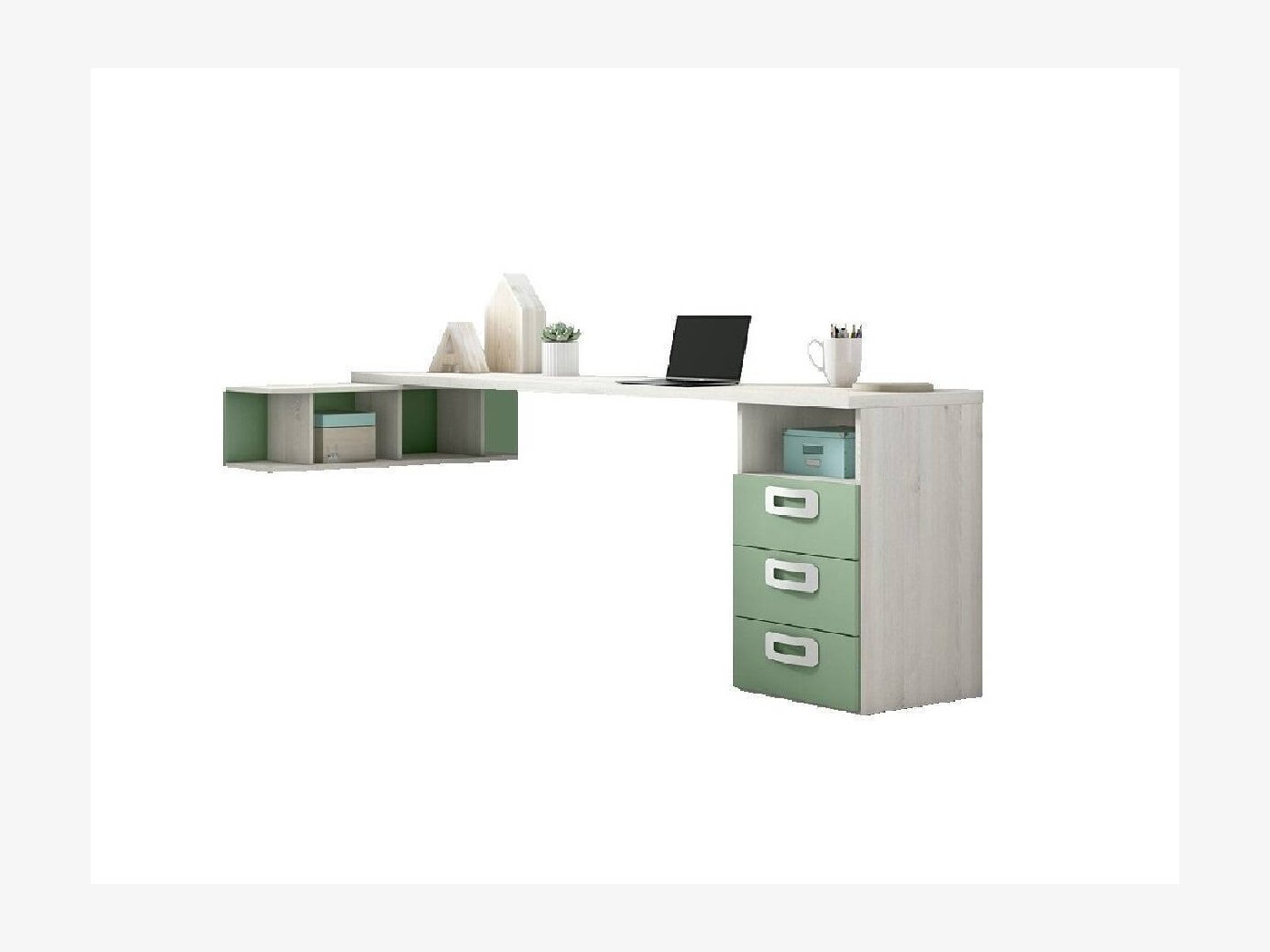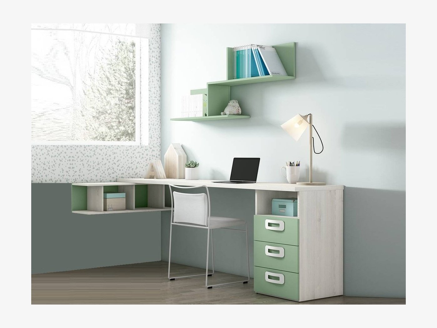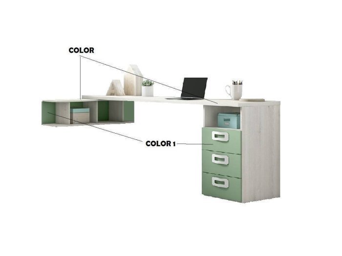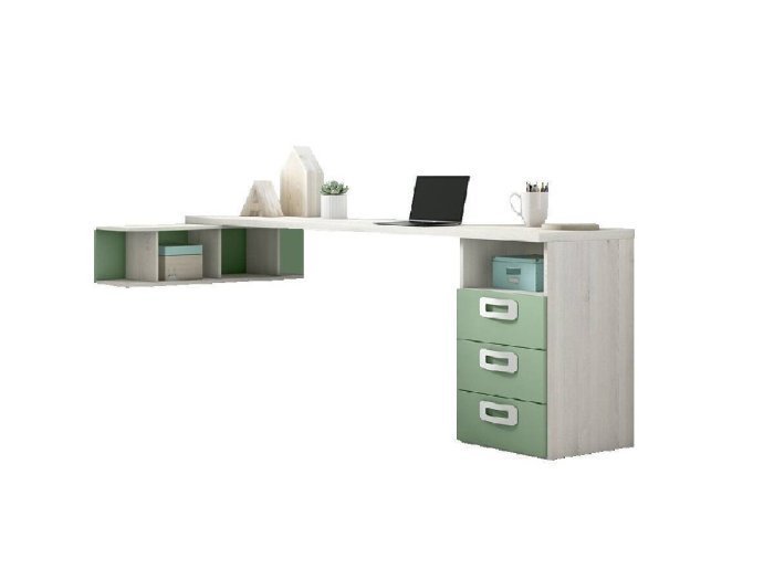 El sobre de la mesa estudio juvenil de 220 cm se combina con una estanteria de 100 cm colocada perpendicularmente formando una esquina de trabajo de 220x100 cm