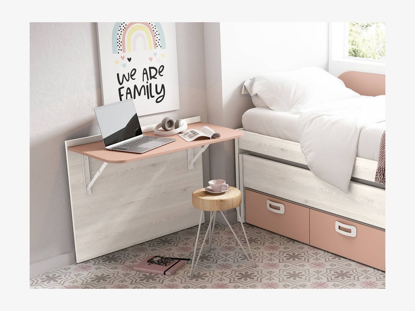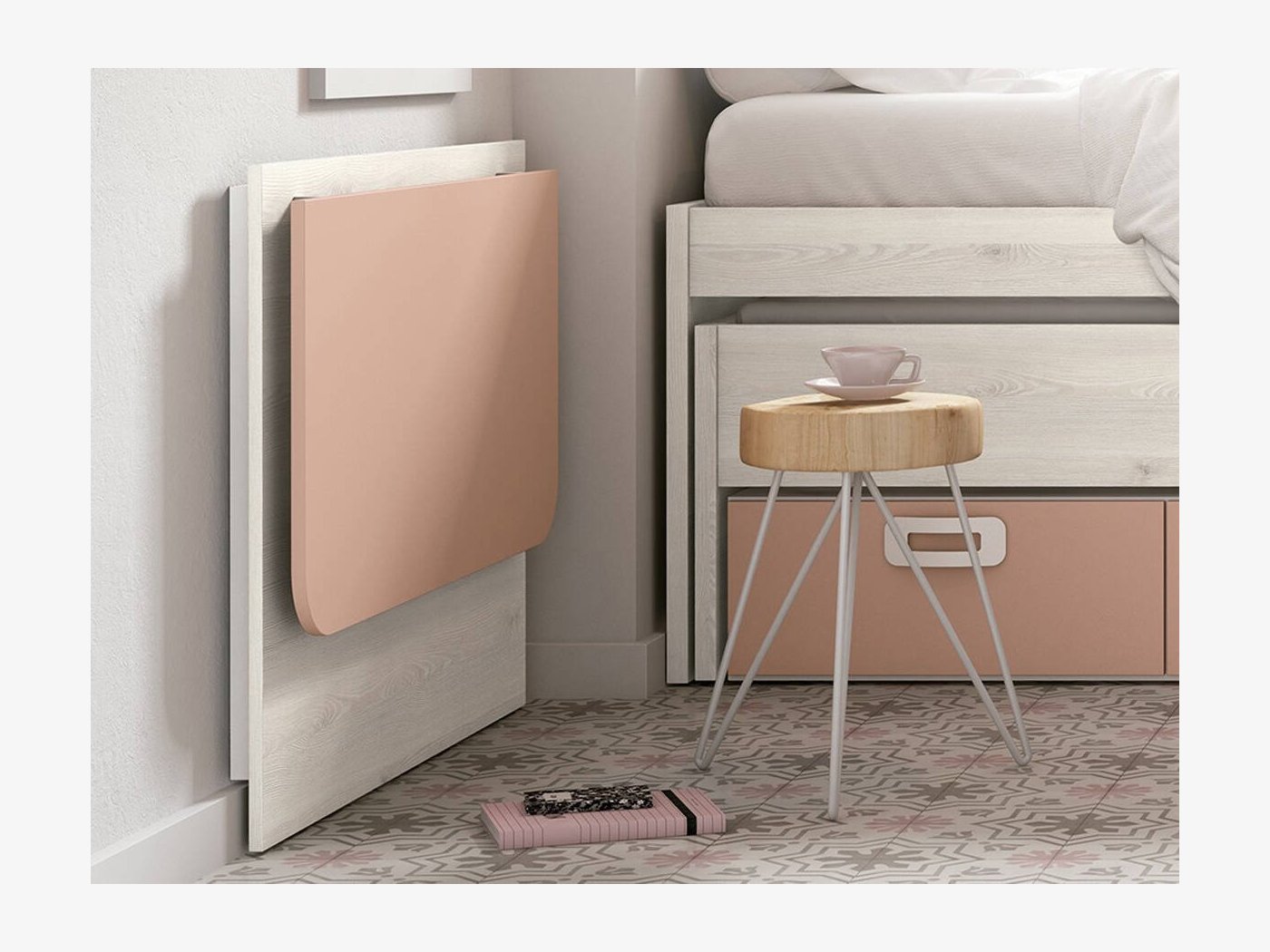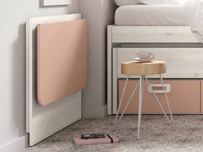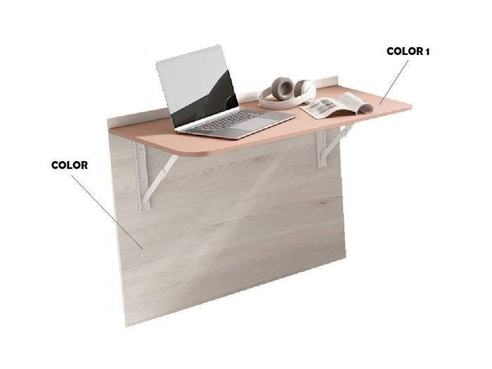 Es el modelo de mesa escritorio plegable juvenil perfecto para habitaciones pequeñas. El escritorio mide 99x53 cm pero al plegarse no supera los 10 cm de profundidad.