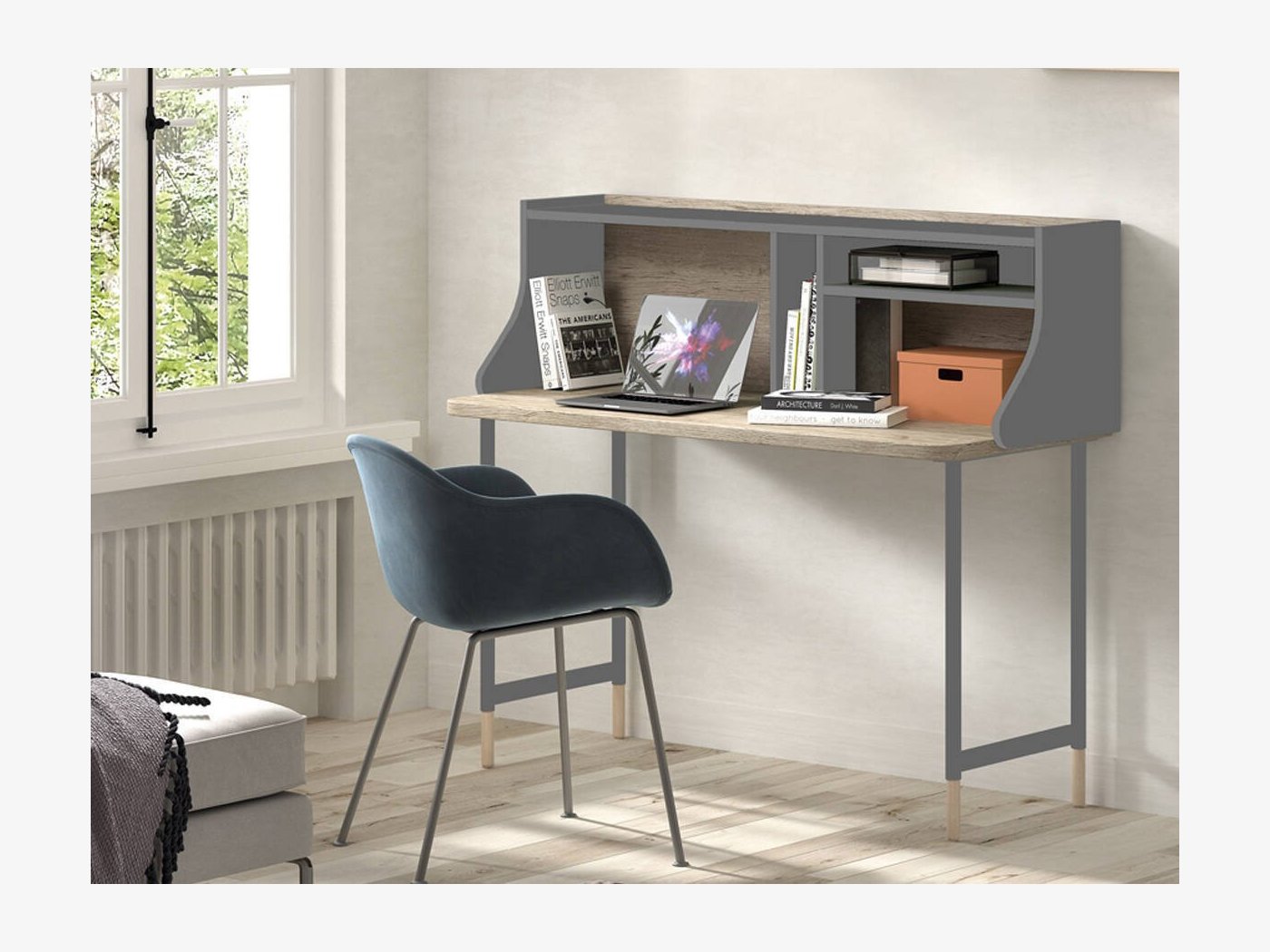 Una vez encontrado el escritorio perfecto para trabajar en casa, añade algunos accesorios como una cómoda silla de oficina, una lámpara o algunos detalles decorativos.