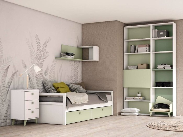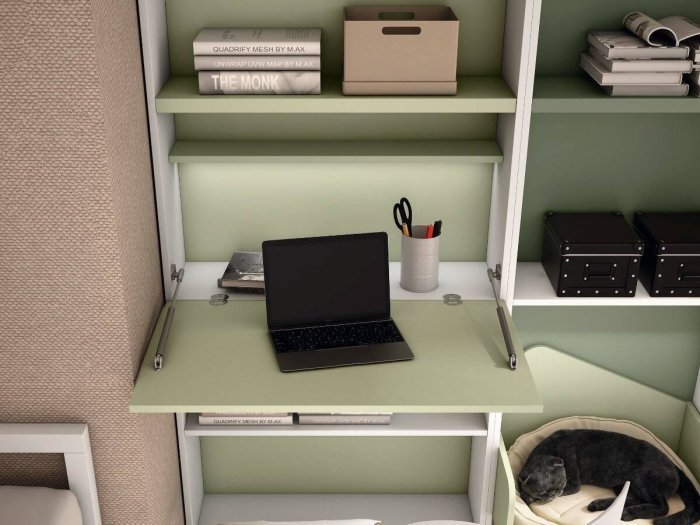 Incorpora un escritorio abatible en la zona central, consiguiendo una zona de estudio o trabajo en un espacio muy reducido, a la vez que ofrece una gran estética a la estancia. Además, el interior del escritorio está equipado con iluminación led con sensor táctil de encendido y apagado.