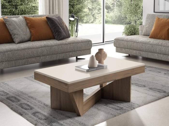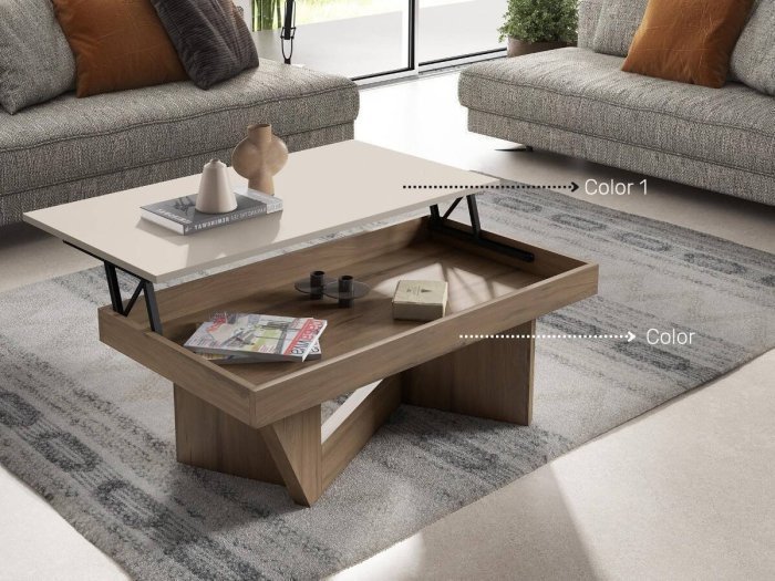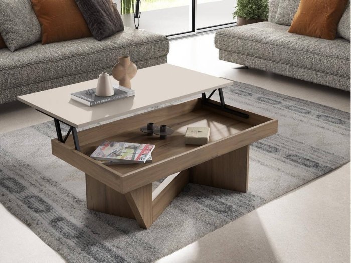 Una acertada y moderna propuesta de mesa de centro, con la nota práctica de su tapa elevable y su caja de alamcenaje bajo ella: cuando la necesitas, solo tienes que levantarla y voilà.