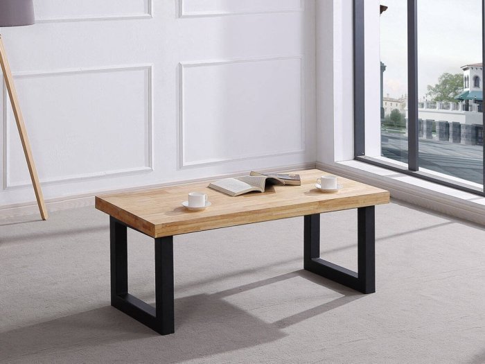 Esta fabricada en madera de roble y metal, con acabado epoxy mate, y cuenta con un cajón revistero bajo su tapa.