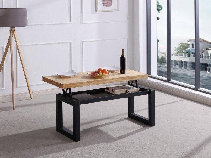 Mesa de centro elevable a 62.5cm, que nos permite comer, cenar, trabajar o estudiar, sin necesidad de desplazarnos de nuestro sofá.