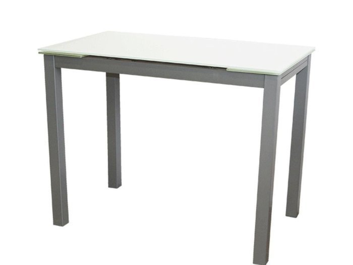 Estructura y pies metálicos acabados en gris plata con sobre y dos alas laterales en vidrio blanco puro de 8 mm.