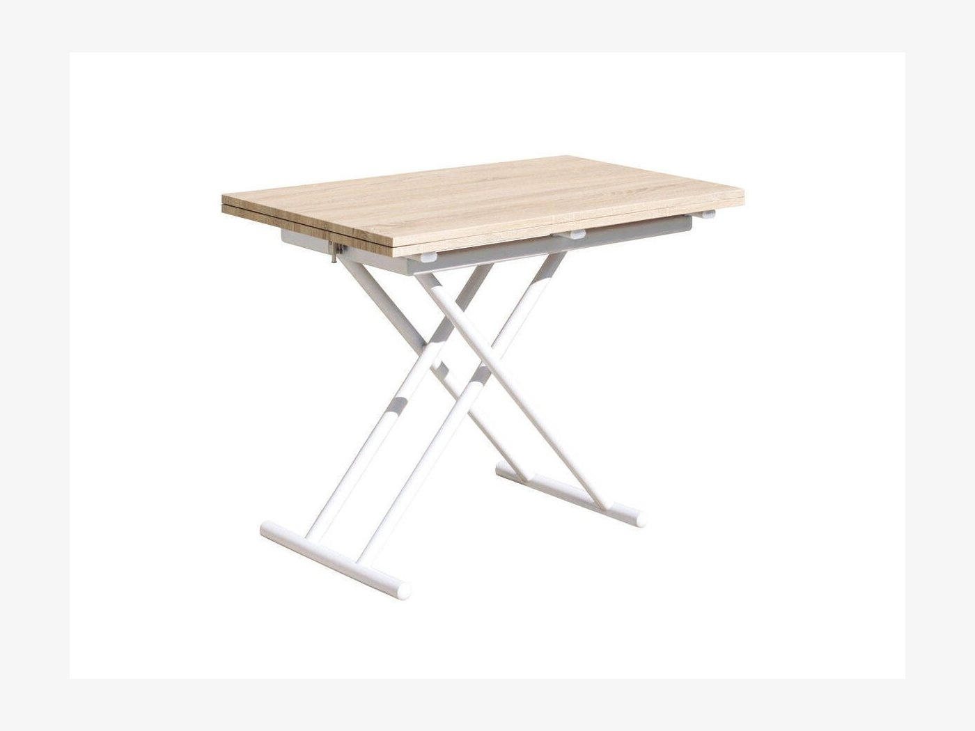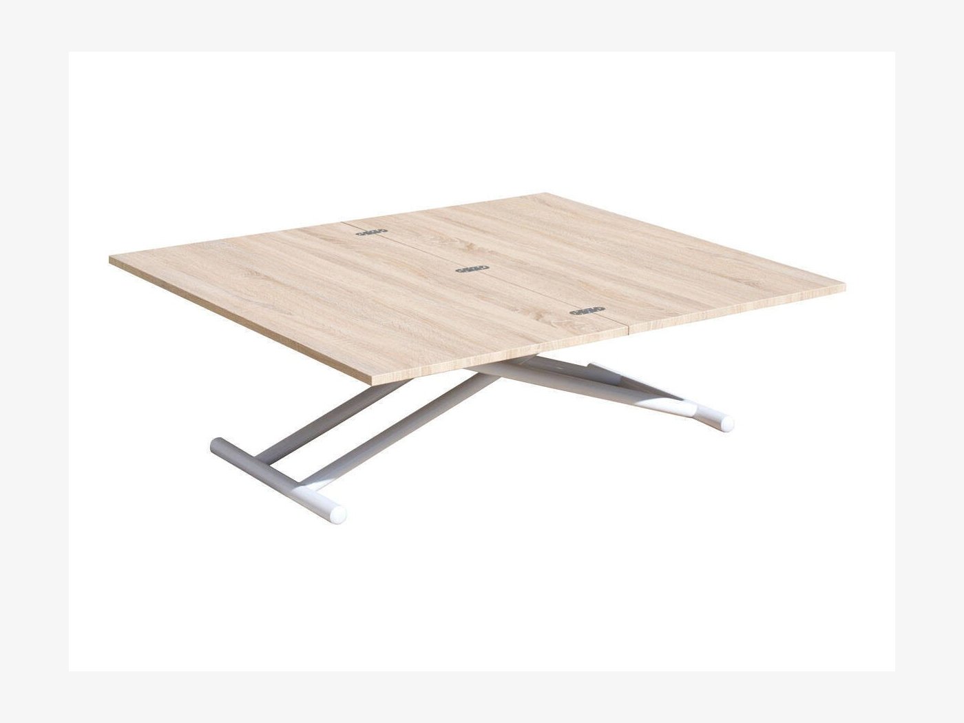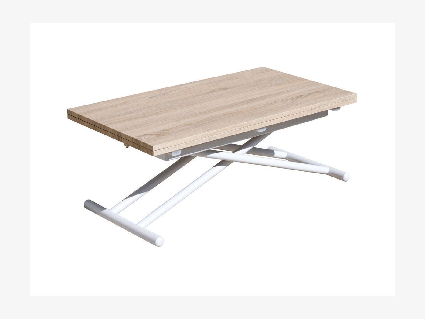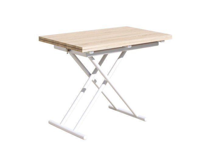 Mesa de centro elevable y extensible, convertible en mesa de comedor. Elevación mediante pulsador.
