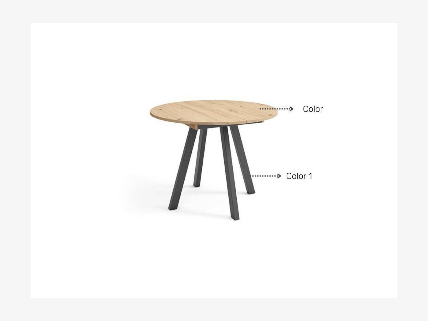 Las medidas de la mesa cerrada: 90 cm (diámetro) x 75 cm (alto); medidas mesa abierta: 135 cm (diámetro) x 75 cm (alto).