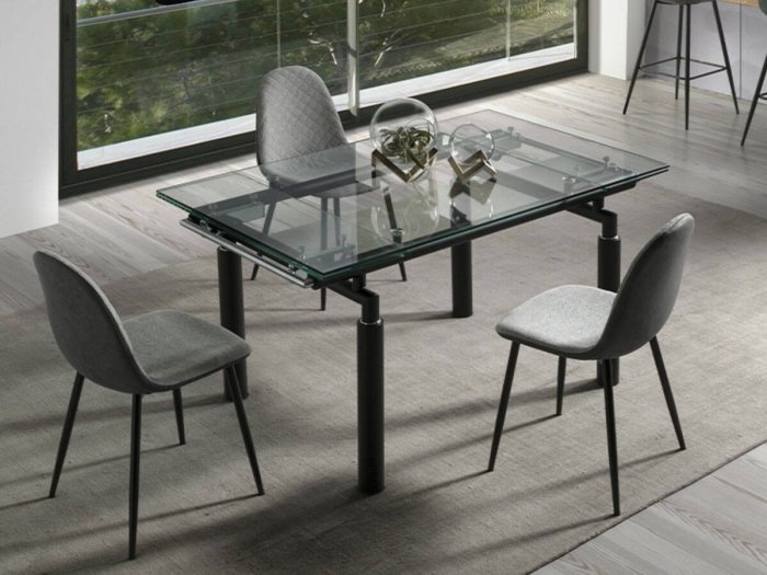 Cristal templado de 12mm, estructura metálica y patas cilindricas en negro mate.