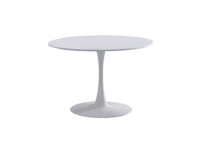 Con un diámetro de tablero de 110 cm y un pie central metálico lacado que se ensancha a medida que llega al suelo hasta convertirse en una base circular que ofrece toda la estabilidad que la mesa necesita. El tablero, en DM, también está lacado del mismo color que el pie.