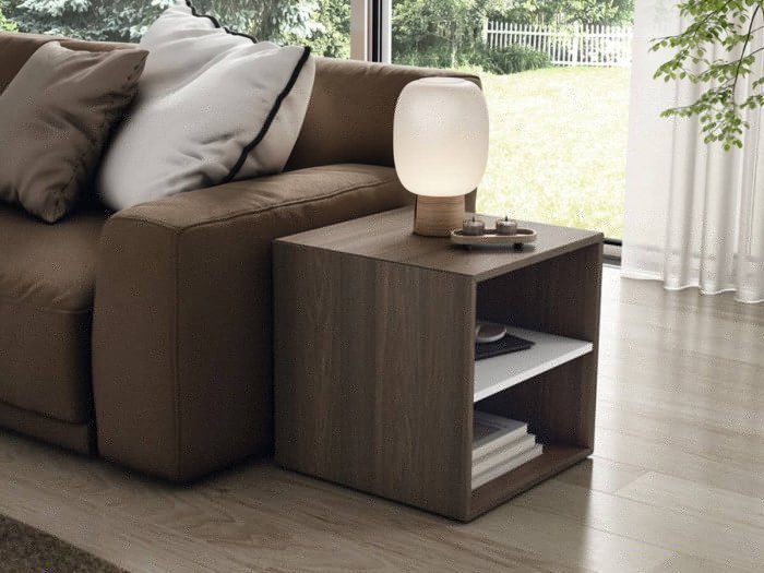 Mesita auxiliar para el sofá en forma de cubo. Un mueble práctico y decorativo que ofrece un espacio adicional para organizar objetos mientras se disfruta de la comodidad del sofá.