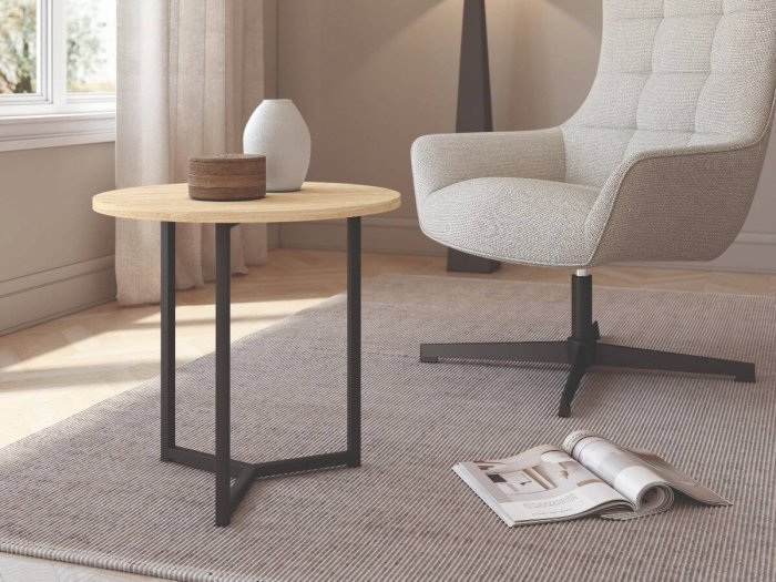 Con un diámetro de 50 cm y una altura de 49 cm, el modelo Gol ofrece una superficie generosa sin perder las proporciones armoniosas, perfectas tanto para espacios pequeños como grandes. Su tablero con efecto madera combinado con el pie metálico, aporta carácter y se combina fácilmente con diversos estilos de decoración: escandinavo, bohemio, vintage o incluso contemporáneo.