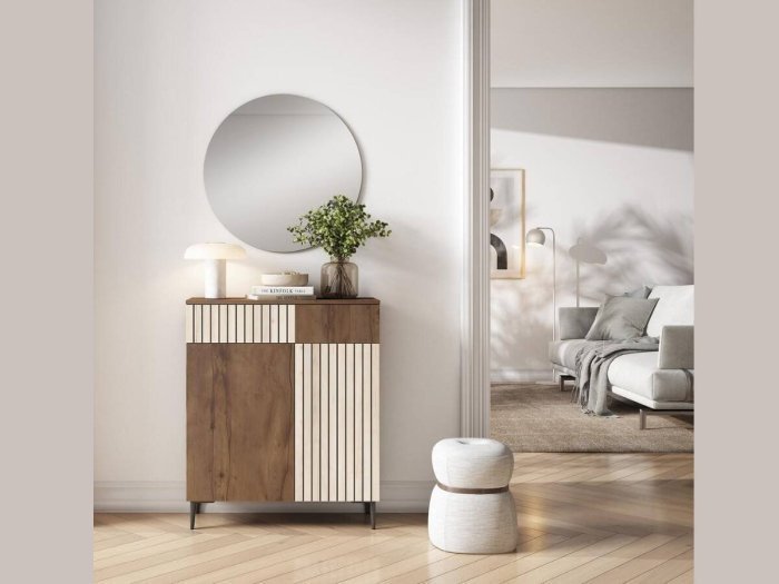 Este mueble tiene una consola con cajón y dos puertas para almacenar objetos pequeños. Es ideal para tenerlas las cosas a mano antes de salir de casa. El espejo es redondo y enmarca toda la parte superior de la consola. Puedes encontrar este mueble en diferentes colores y materiales, tanto liso como efecto listones de madera.
