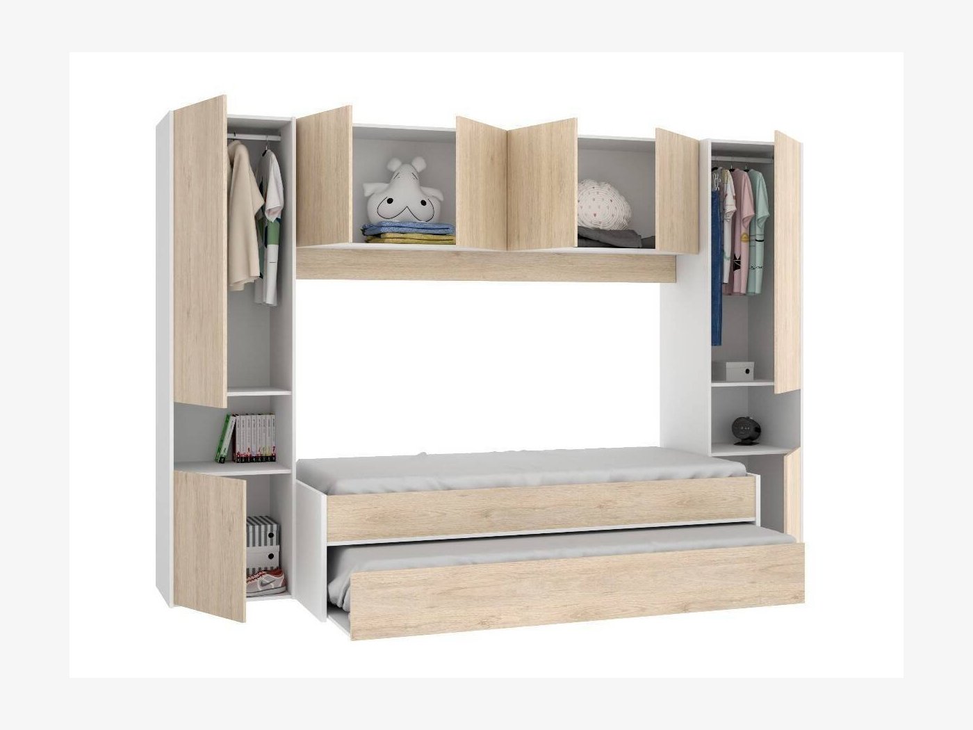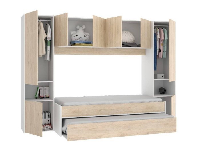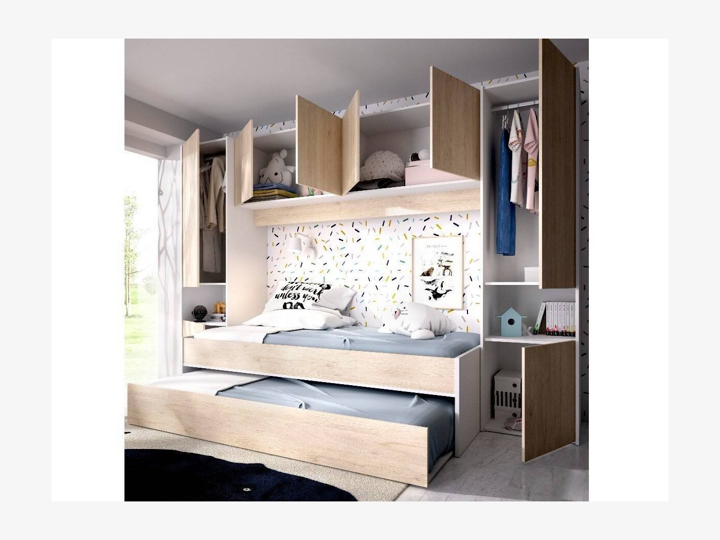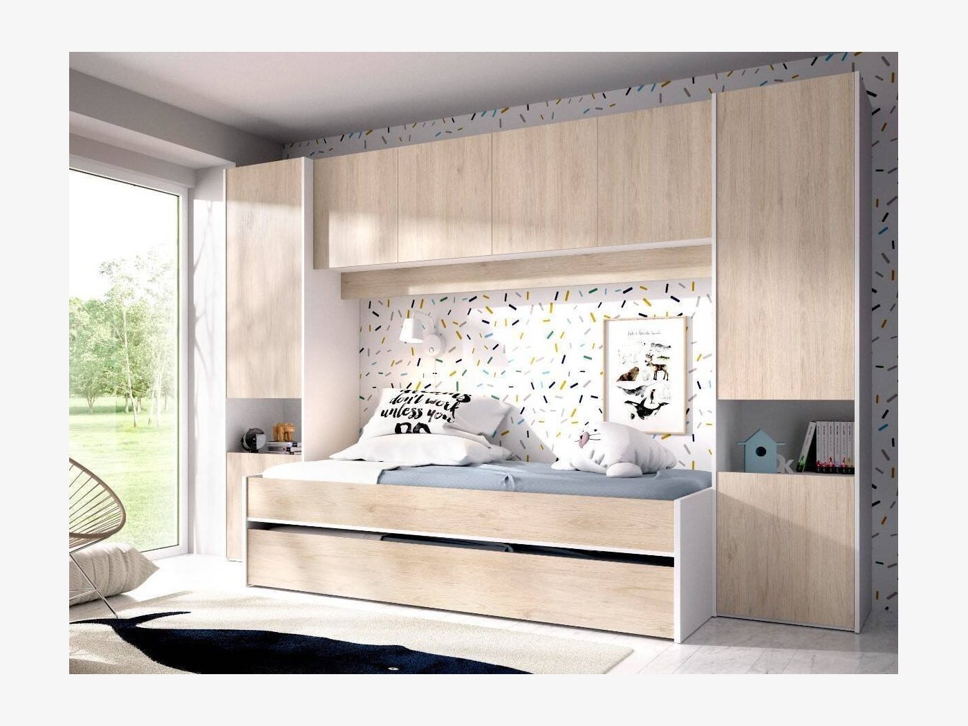 Este conjunto puente es perfecto para amueblar una habitación infantil, juvenil o de invitados, ya que en sus grandes dimensiones encontrarás la solución perfecta. Se trata de una cama puente de diseño moderno y con espacio de almacenaje para tener todas tus cosas en orden.