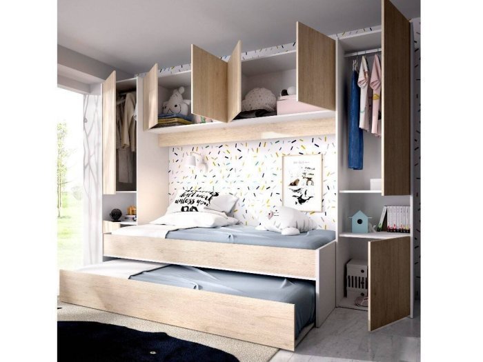 La cama nido está equipada con una segunda cama inferior. Dos camas en el espacio de una. La cama inferior lleva incluido base de arrastre con ruedas
