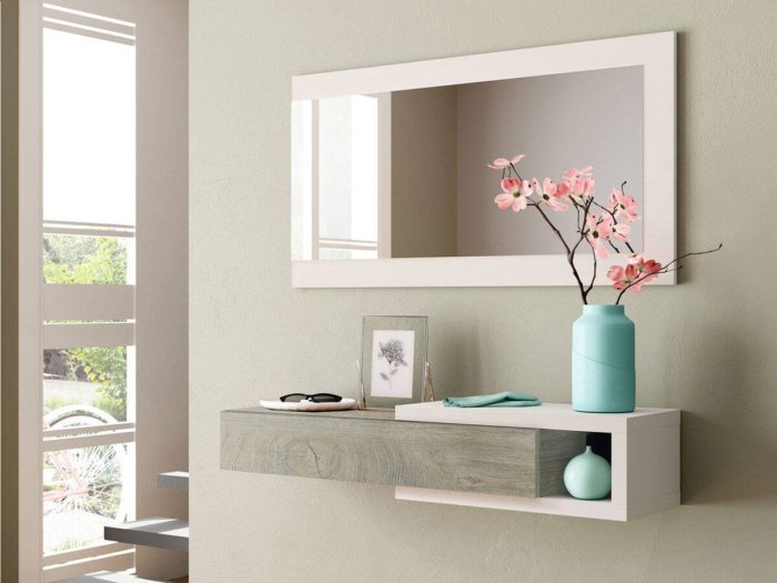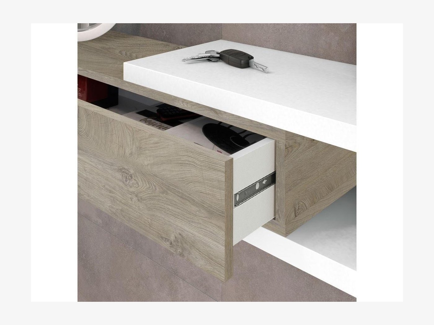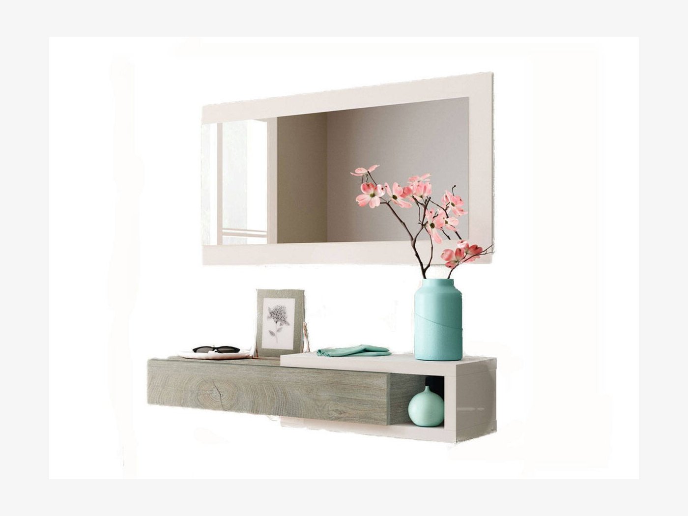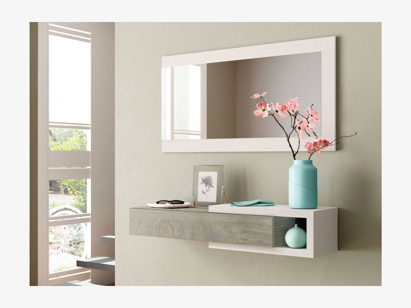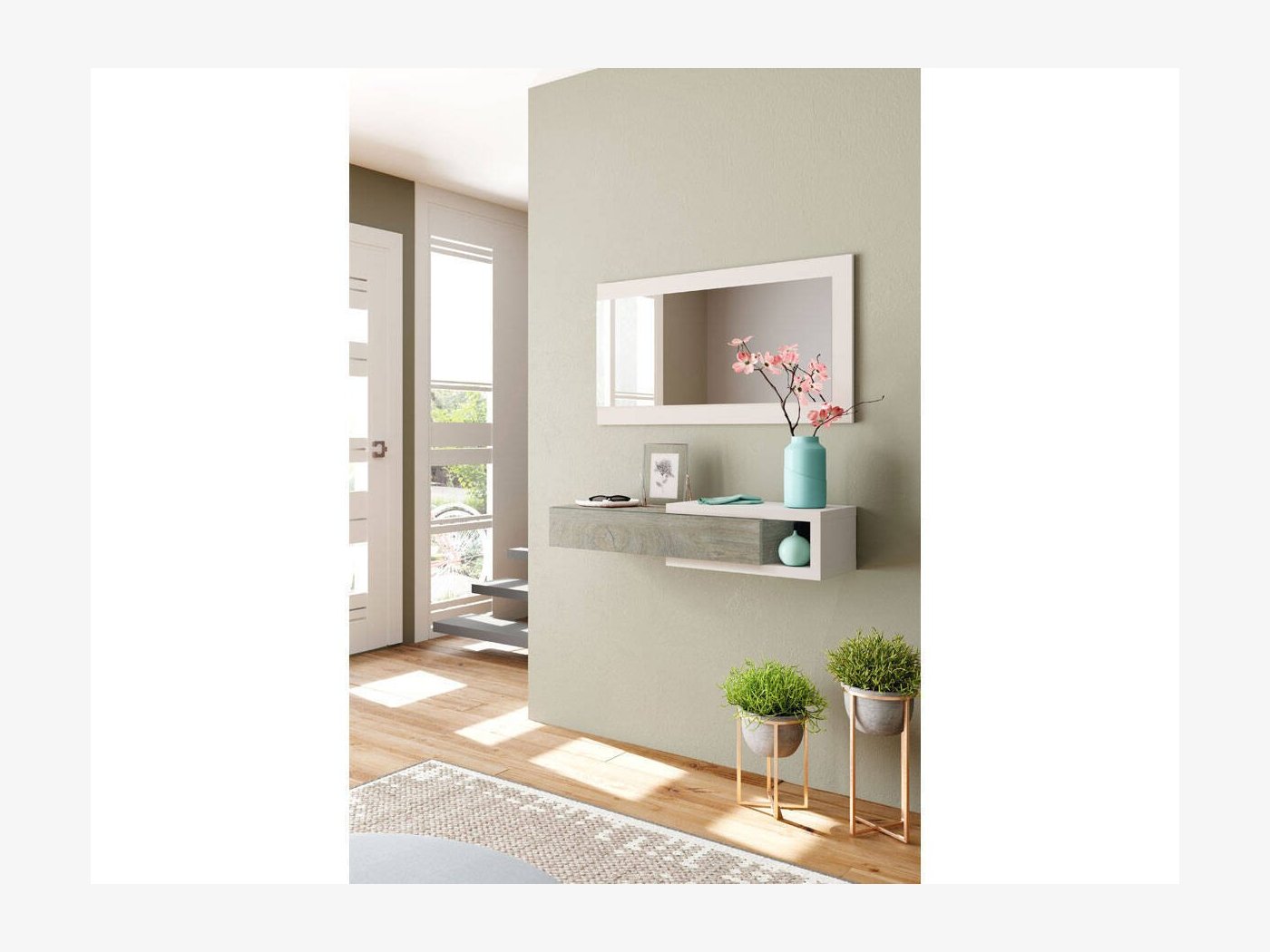 Llévate este mueble recibidor con cajón en color roble combinado con blanco poro y también marco del espejo.